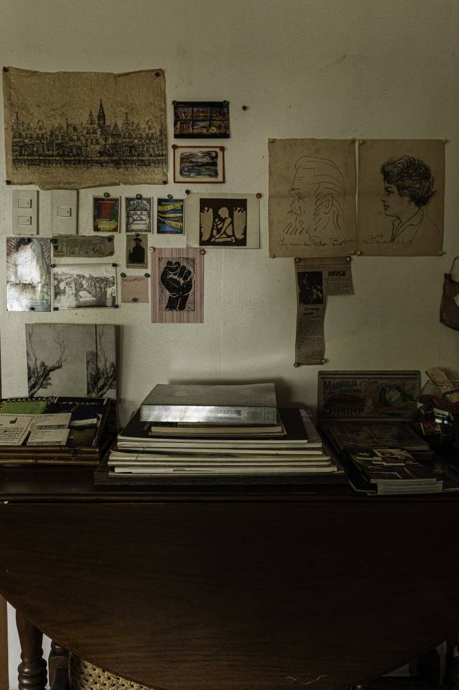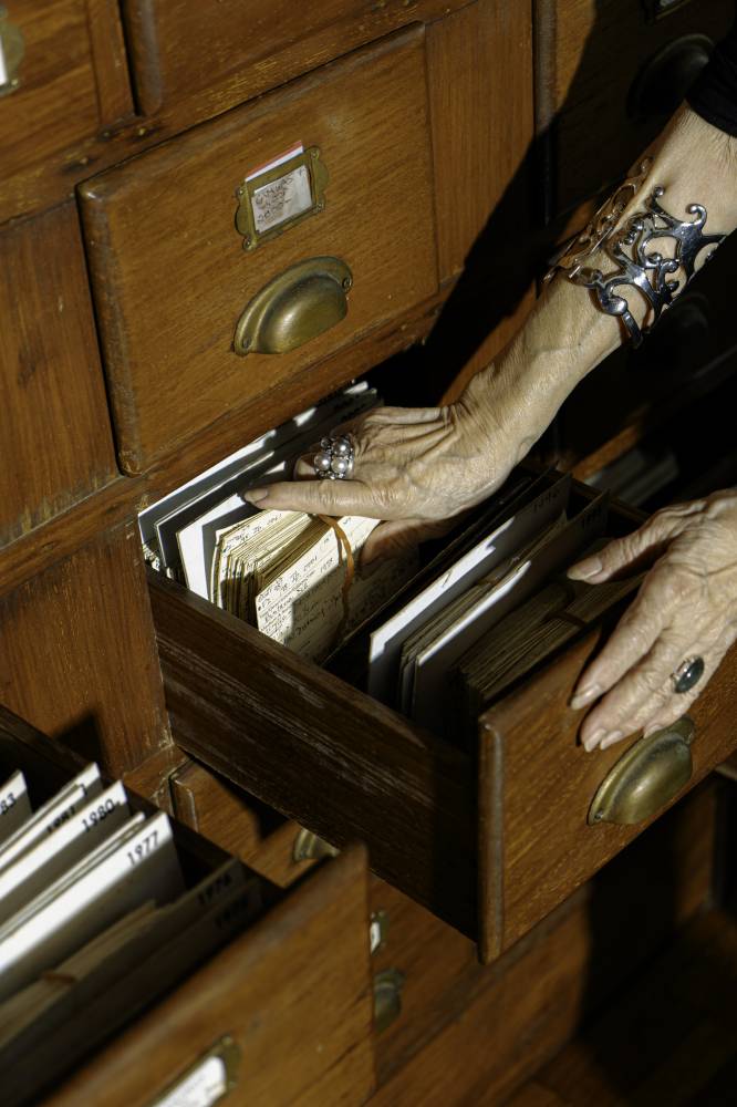 But it isn’t only objects of memory. The room is, of course, a working space: long tables lined with brushes and pens, all clean, neatly organized, and ready for art-making, a massive stainless-steel sink for washing palettes, and walls of cork for notes and drafts. On the ground floor, a great wooden cabinet houses her meticulous archive, organized in a numerical system taught to her by librarians from the National Library, and adapted from the Dewey Decimal method. Each index card details where an artwork was made, exhibited, or sold, and includes a printed photograph clipped neatly to the card, ensuring no painting ever goes unaccounted for.