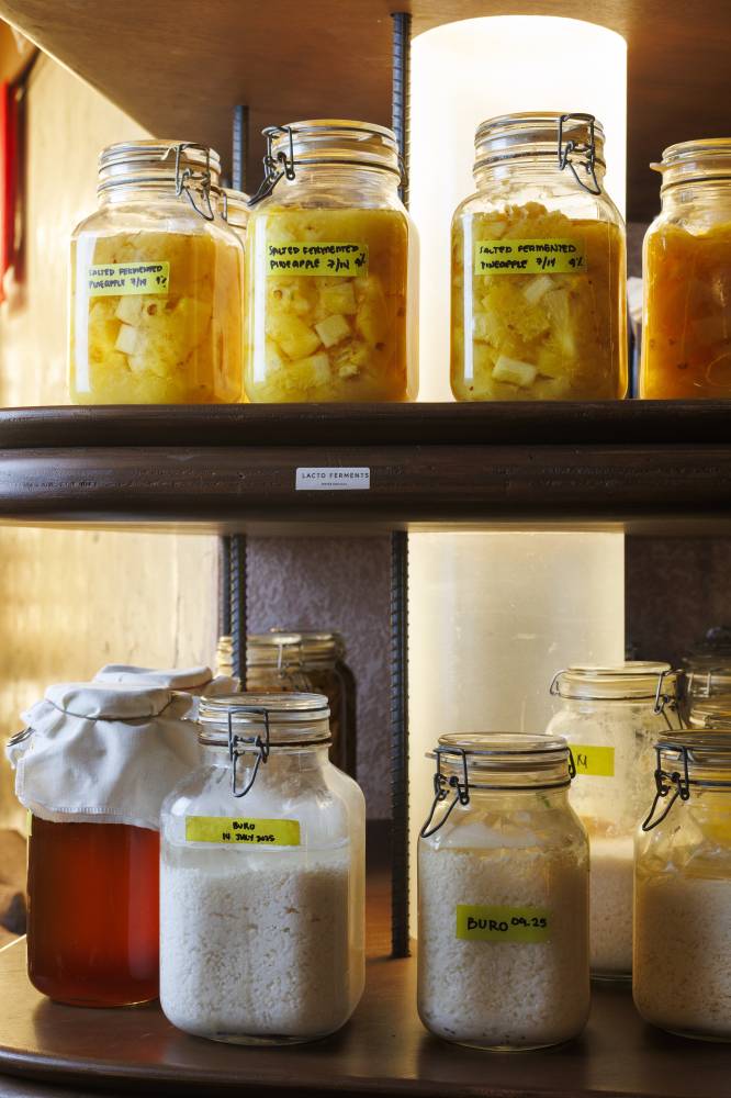 Walking in, your eyes sweep over the chefs in motion, silently in focus at their own stations in the kitchen, then to the long stretch of a wooden counter with lights hanging low, and finally, the lounge seats to your right, framed by shelves of bottled and jarred ferments that clue you in on the meal to come.