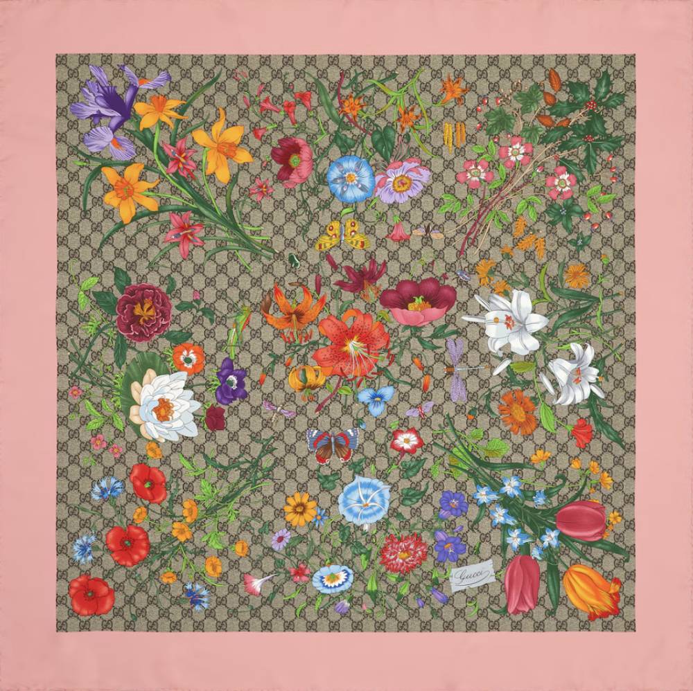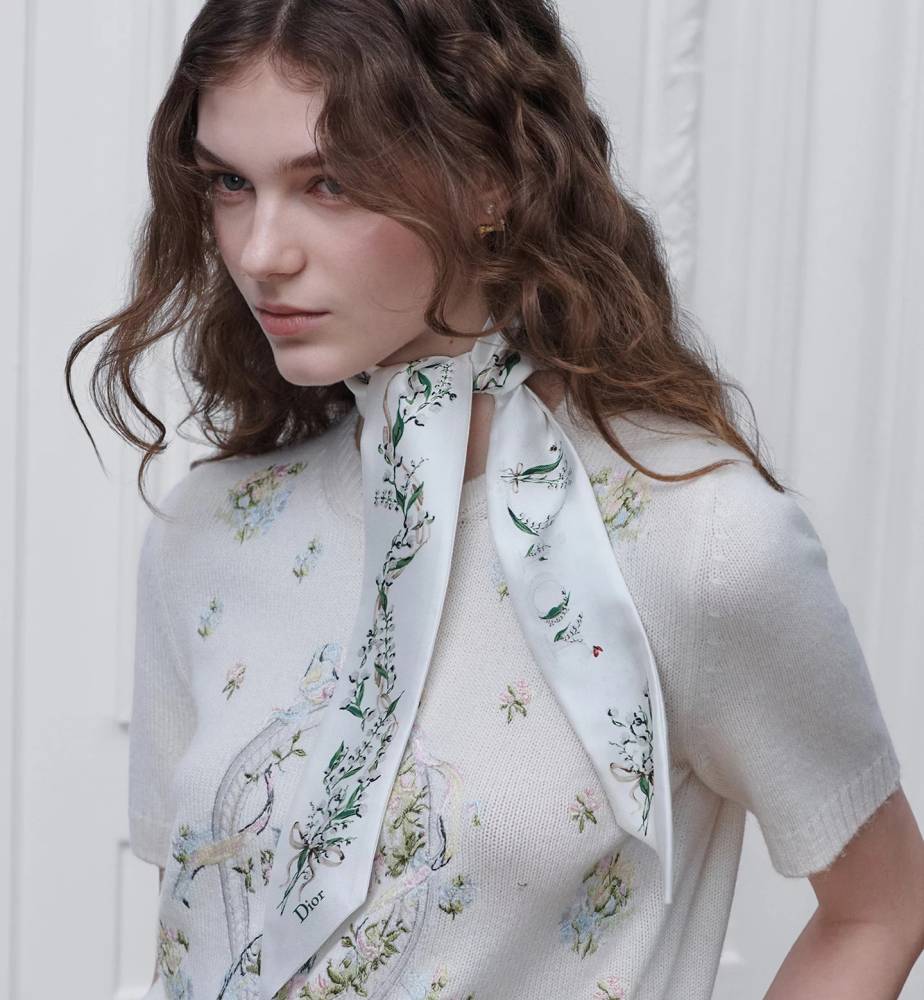 Then there is the revival of the Gucci Flora scarf—a print born in the 1960s that continues to resurface across generations. It is romantic without being naïve, recognizable without being overwhelming. Tied at the neck, it suggests polish. Wrapped over the hair, it signals intention.