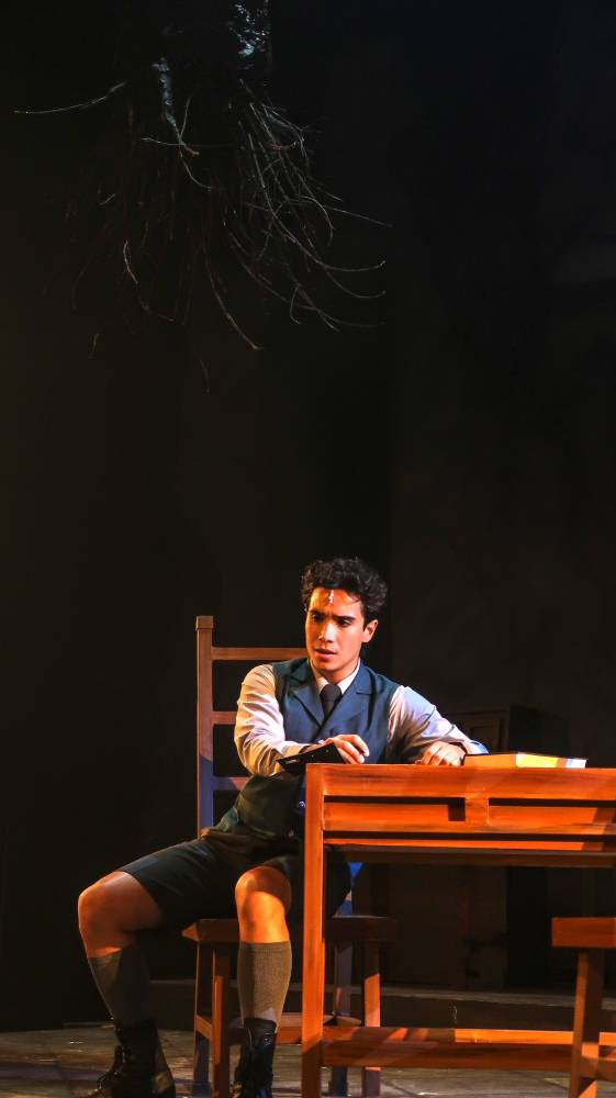Pamintuan doesn’t shy away from the original material and makes no external attempt to localize his revival. Wika Nadera’s symbolic stage design feels reminiscent of fascist, cold architecture and design, while a descending platform in the shape of a cross hangs above the youths throughout most of the first act. A tree hangs suspended in the air with its roots exposed, a gorgeous symbol of what these characters must feel like.