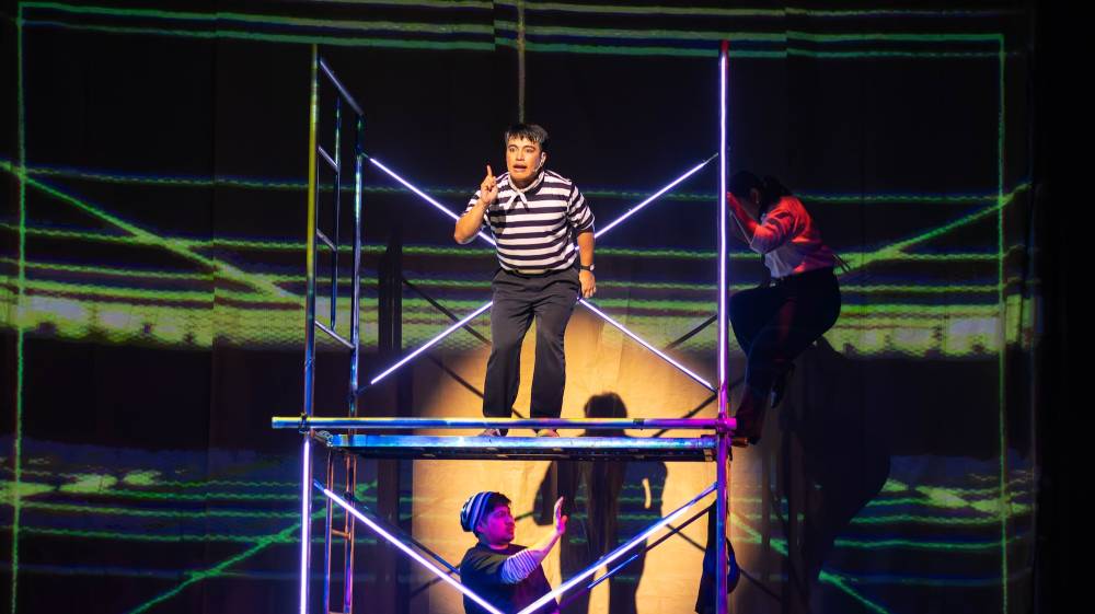 After the intermission, “Children of the Algo” brings us into the virtual world of content creators. Four actors—Otep Madriaga, Nyla Festejo, Frances Marie Akol, and James Pe Lim—play social media influencers as they post videos and livestream their daily lives and struggles.