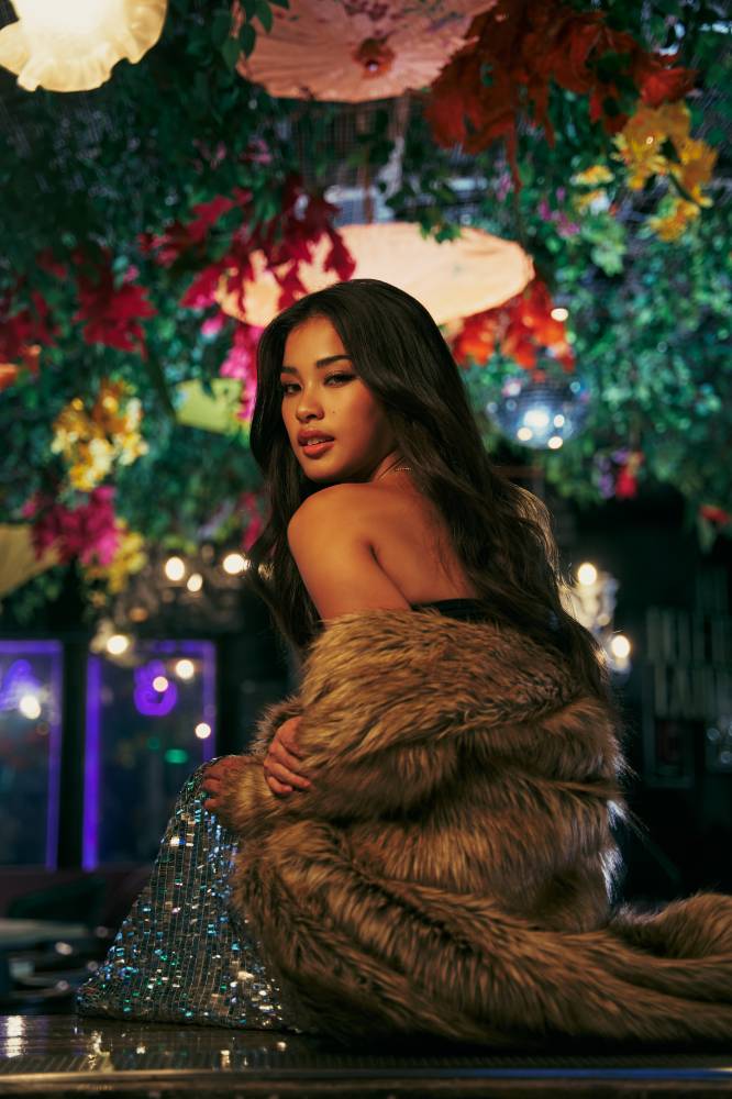 And call her cheesy, she says, but she likes to believe that “God has given me the heart to shine my light on people.” Well, she’s definitely doing that with her form-fitting skirt that sparkles like a disco ball. Now on her second layout, she lounges atop the bar counter. “Like a mermaid,” we tell her. “Parang bangus!” she retorts with a laugh.