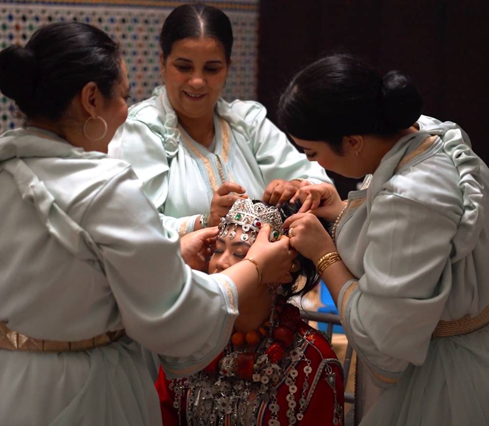 When she wore the Amazigh garb, complete with the traditional silver headpiece and layered necklaces, she felt accepted into another lineage. She was lifted on an Amariya, elevated so the room could celebrate her passage into marriage. She changed dresses five times, each representing different regions and traditions. Professional attendants, known as Neggafates, managed every detail of her attire while guests danced to live percussion.