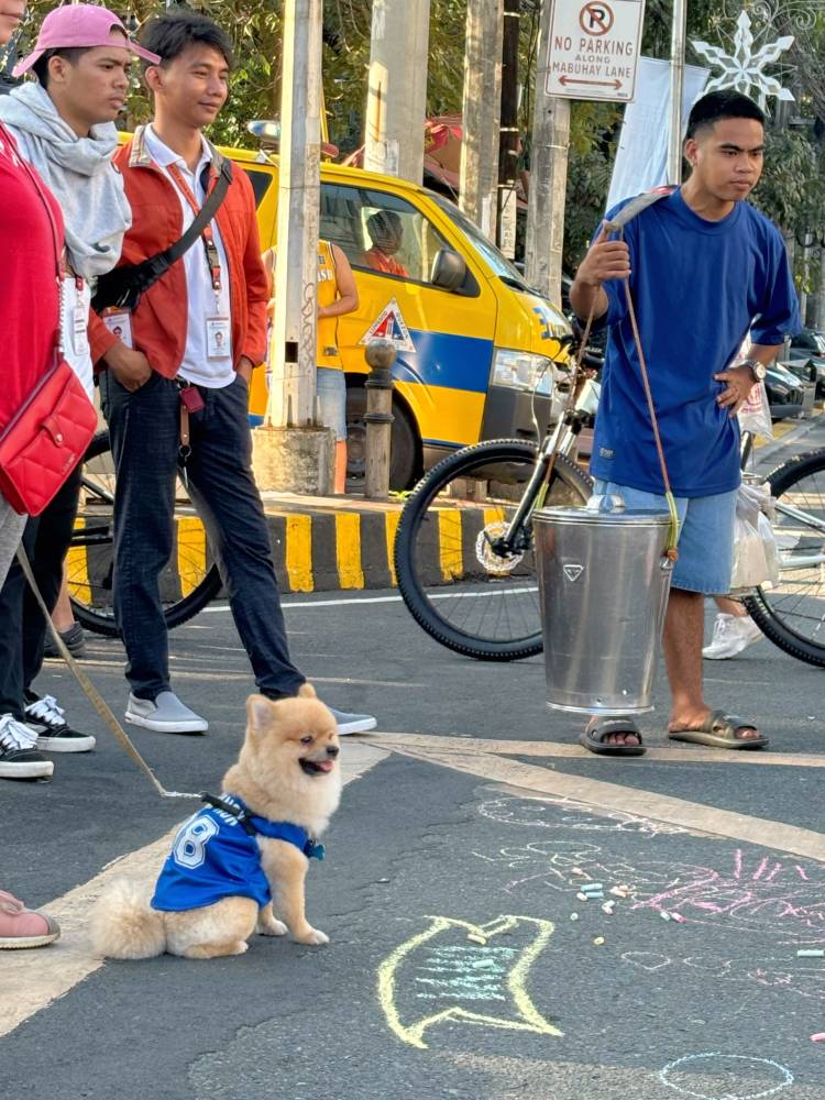 Next to the Zumba area, children get hold of colored chalk, drawing and scribbling on the street—flowers, birds, bees, random strokes and swirls. A curious taho vendor joins the fun. And as it all happens, a Pomeranian looks on as if standing guard.