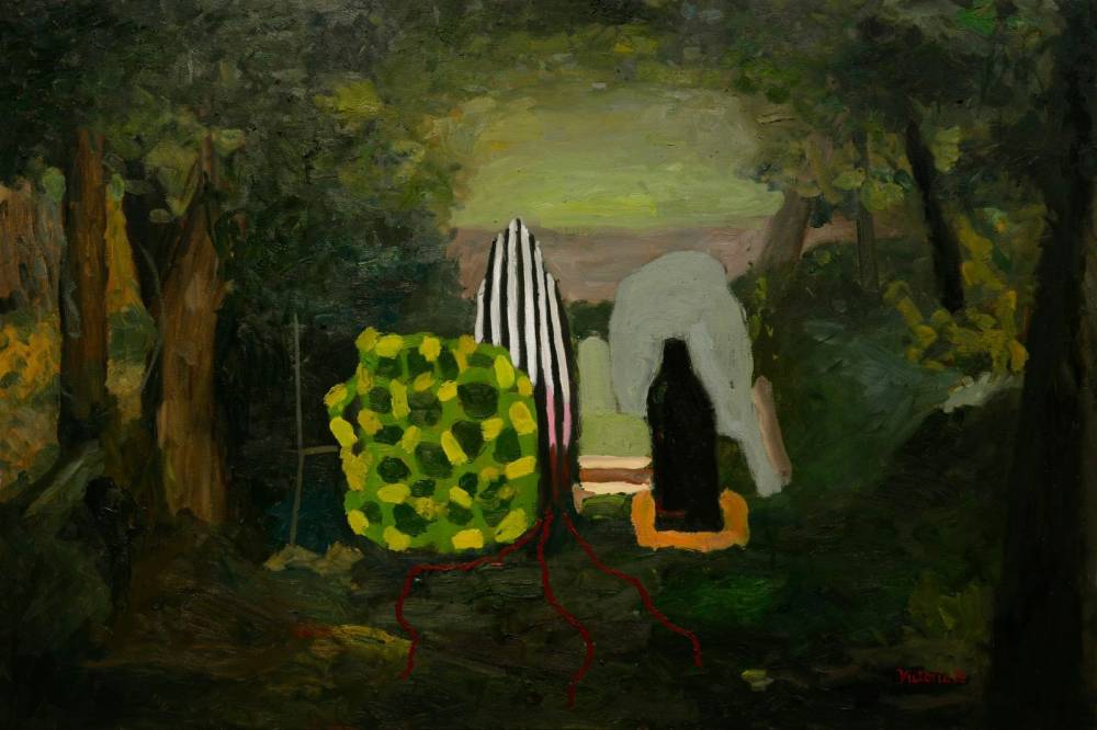 In these new paintings, her works feel noticeably brighter than her past work. She maintains her practice of painting backgrounds of otherworldly forest scenes. But now, Victoria replaces her sharp geometry and darker figures with brighter, more playful forms that even seem friendly.