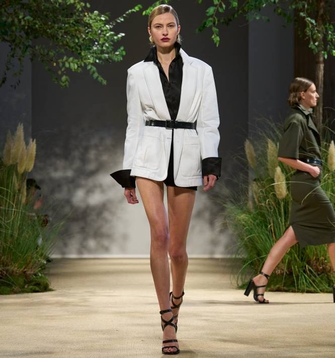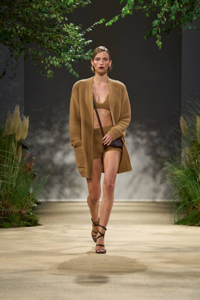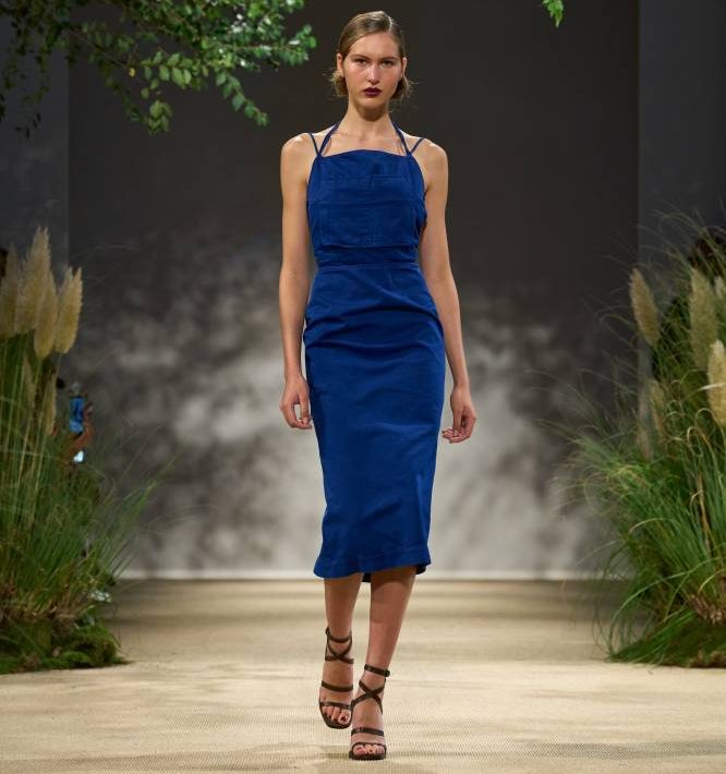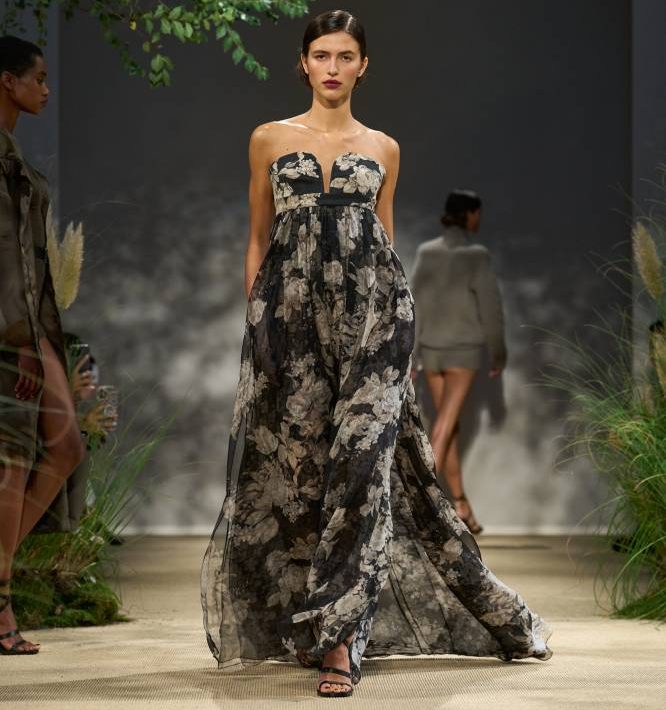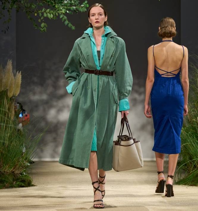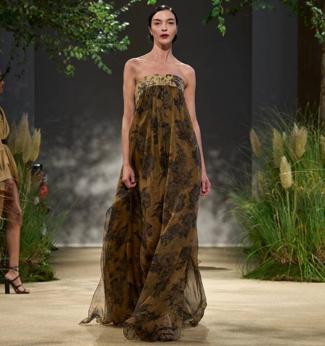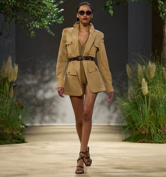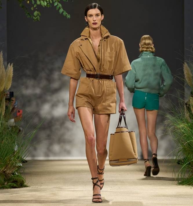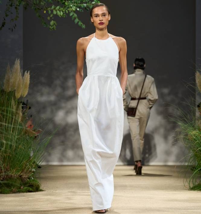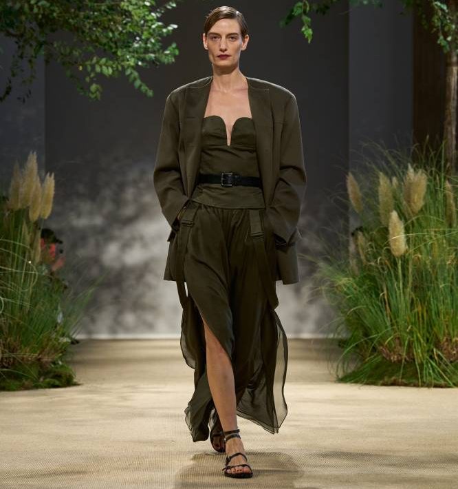 Of course, there are sandy neutrals too, bringing understated luxury to perfectly designed trench coats, generous military style jackets and rompers. Backless sundresses inspired by gardeners’ aprons and triple layered chiffon gowns with gaberdine straps take the tough chic message from day to evening.