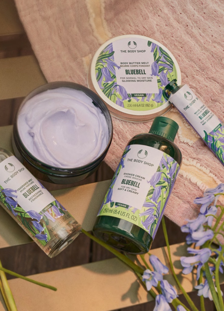 Follow your routine with the soft, nourishing Bluebell Body Butter Melt, a new texture for The Body Shop, providing a dewy glow all over your body. Touch up during the day with the Bluebell Hand Cream for a delicate floral scent trail all day long.