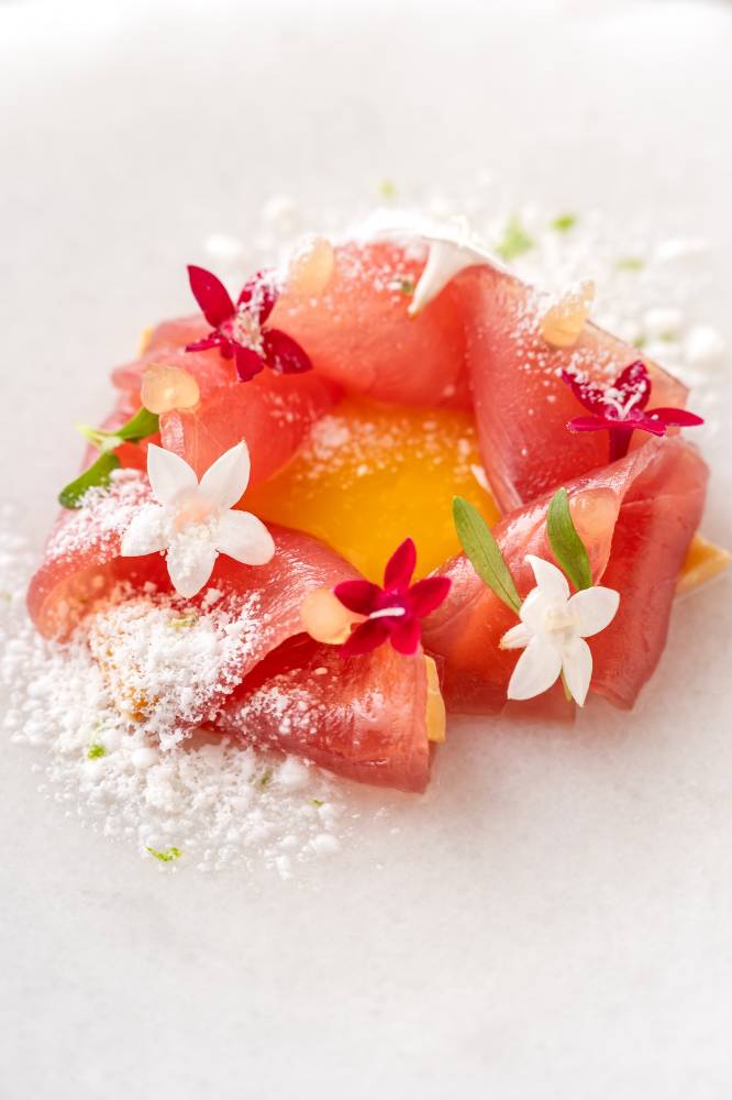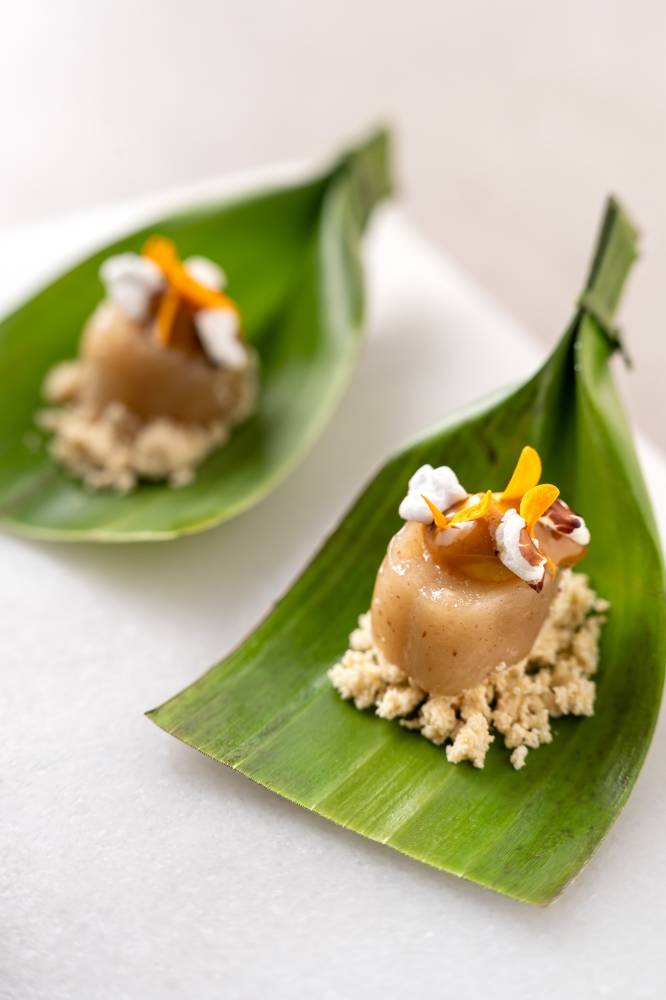 In the Stvdio Lab, they conceived a fermented mango using bubod, a traditional starter commonly used in local rice wine, to extract a ruffled texture and feathery mouthfeel, complementing the sweet fruit. Depending on how you see it—a dusting of snow, a fuzzy carpet—it’s impeccably experimental.