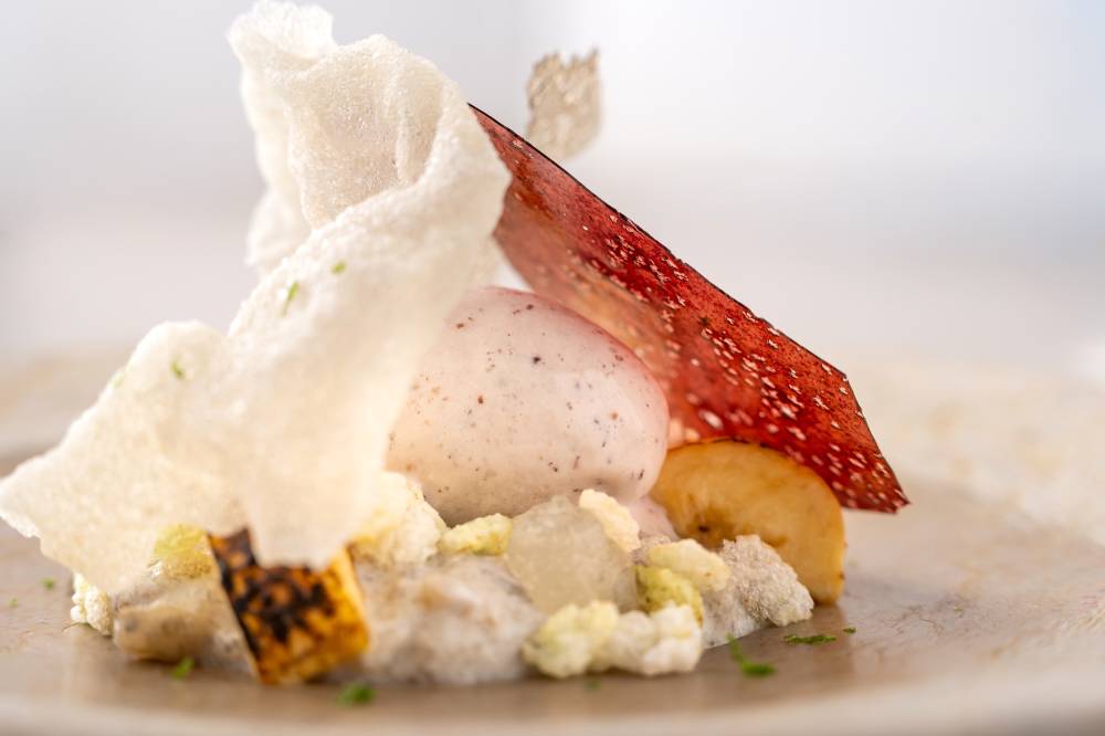 Where he really ramps it up is on his pre-dessert course called Rice Textures, creating arroz con leche from Pangasinan’s deremen, suman ice cream from Visayan tapul, white rice cracker from the grains of Ifugao’s Mayoyao tribe, and sprinklings of pinipig, Mountain Violet rice, and minaangan to complete the course.
