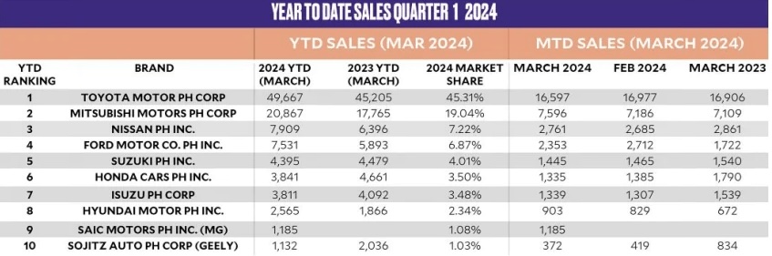 Nissan PH, Inc. recaptured the coveted third spot from Ford Motor Co. PH, Inc. which had been perched there all year last year. Nissan sold a total of 7,909 vehicles year-to-date March 2024 while Ford sold 7,531 vehicles: a difference of 1,513. Nissan turned the tables on Ford this first quarter which was no mean feat considering that YTD December 2023, Ford outsold Nissan by 4,184 units: Ford’s 31,320 compared to Nissan’s 27,136. Now the question is: Will Nissan be able to maintain its lead, or even grow it, in the next three quarters of 2024?