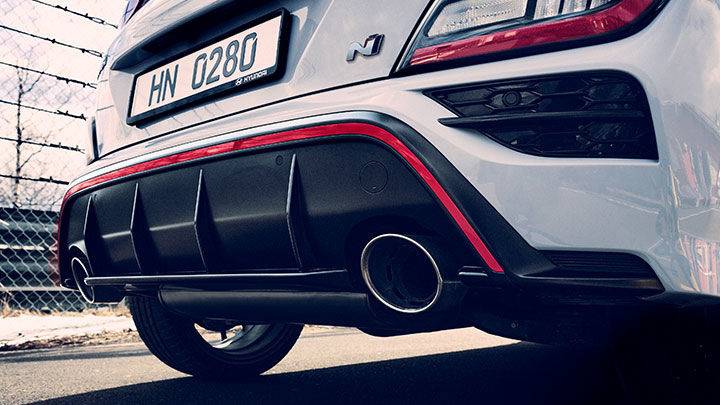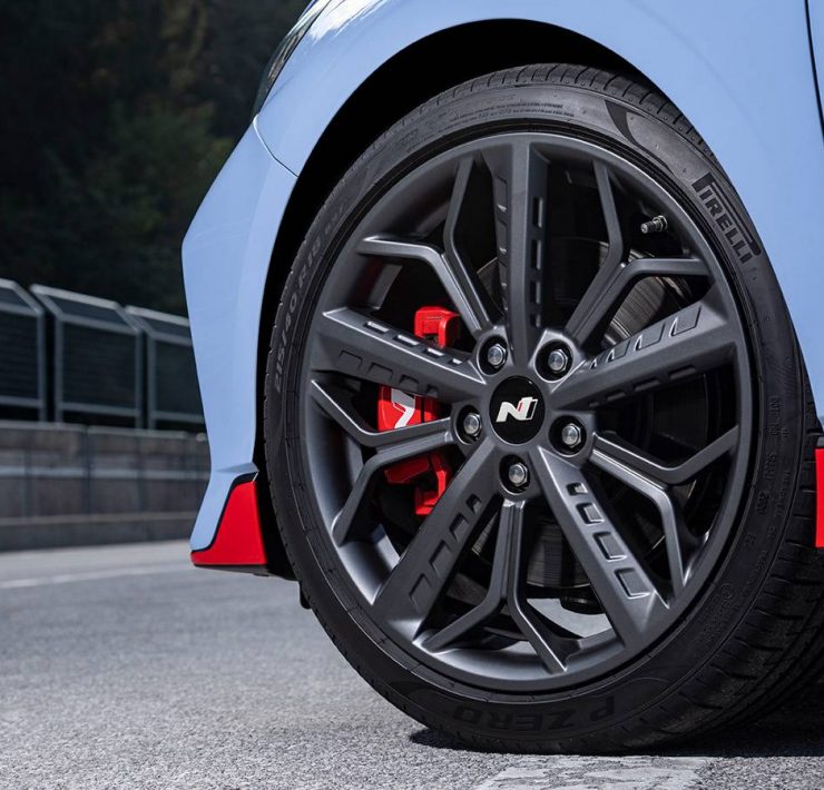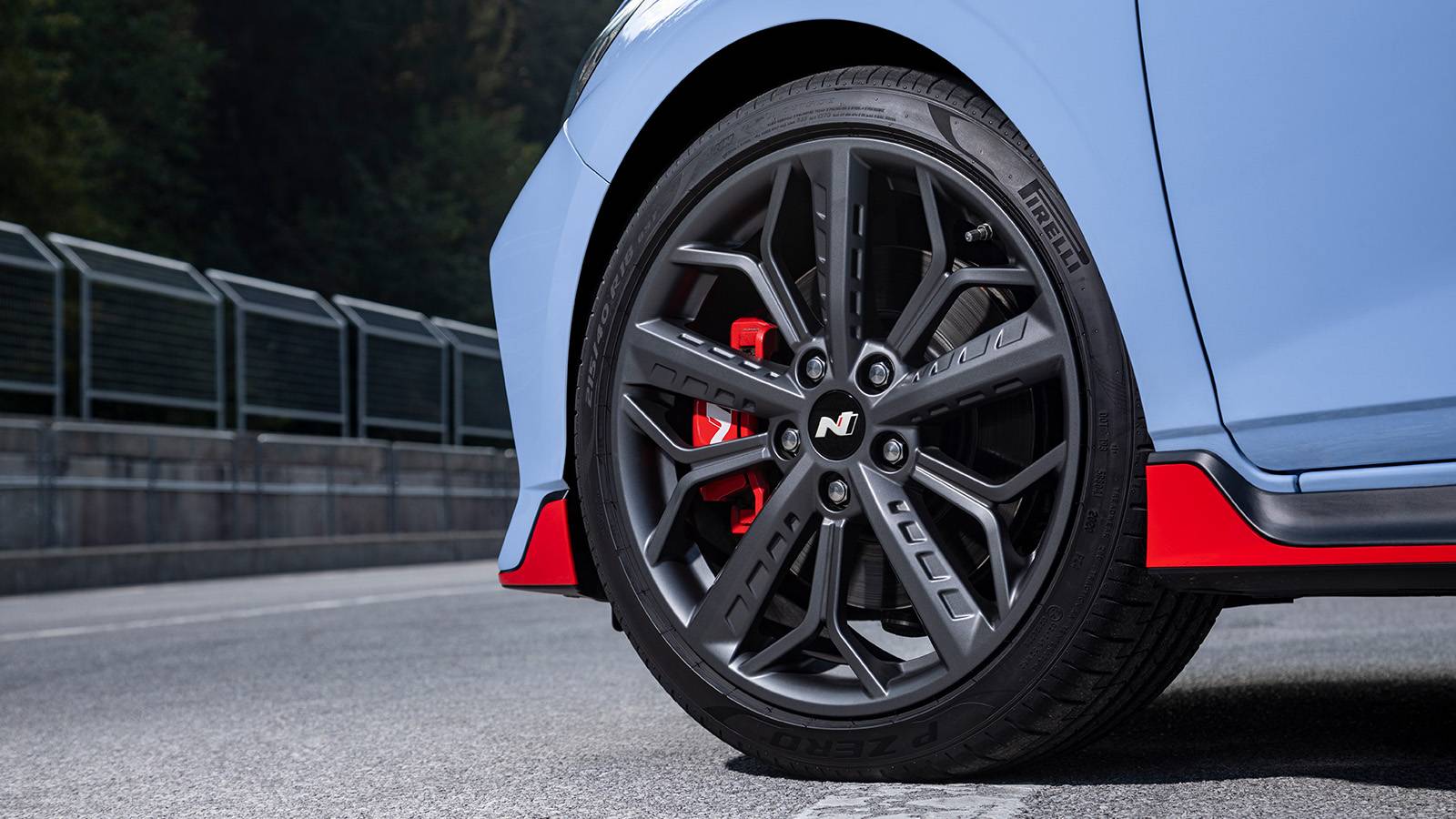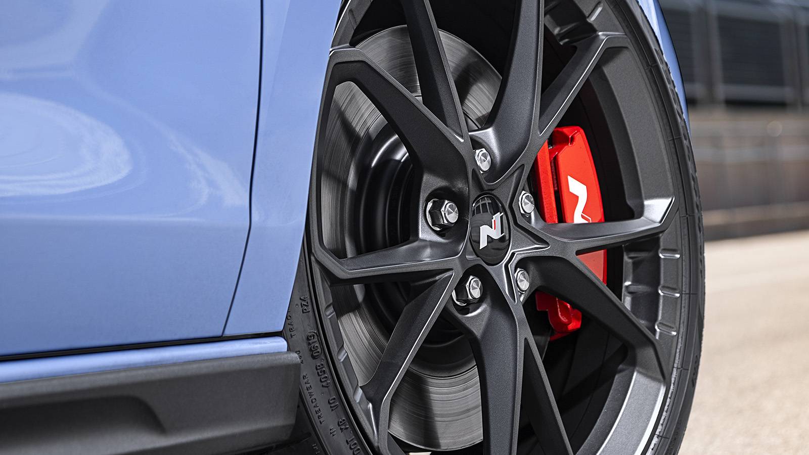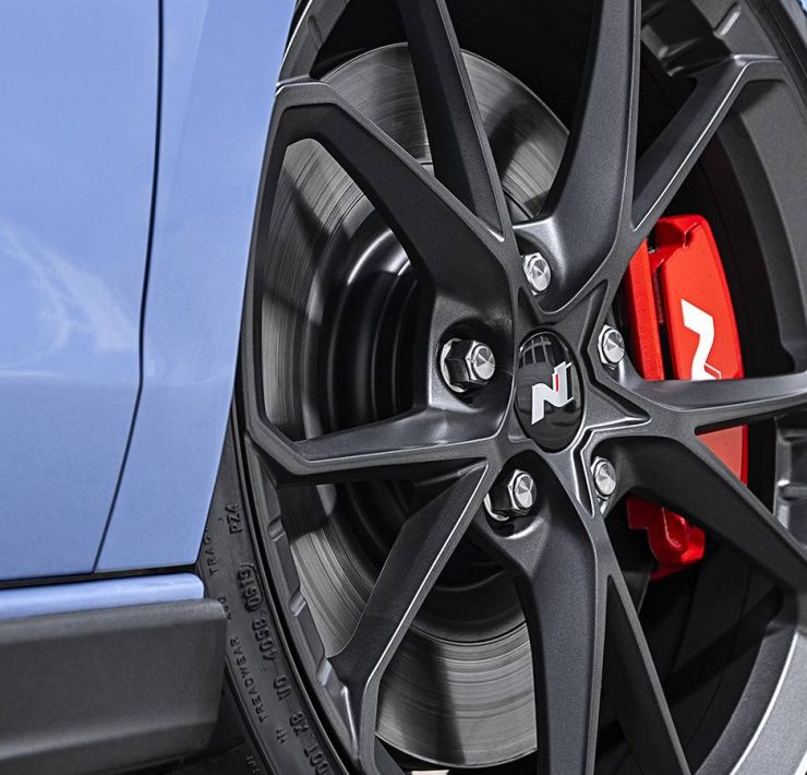 Helped by its WRC pedigree, this little Hyundai weighs just 1,190 kg and gets a reinforced chassis and stiffer suspension. And peeking behind the gloss-black 18-inch alloy wheels are high-performance front brakes with 320-millimeter ventilated discs up front and 262-millimeter solid discs at the back.