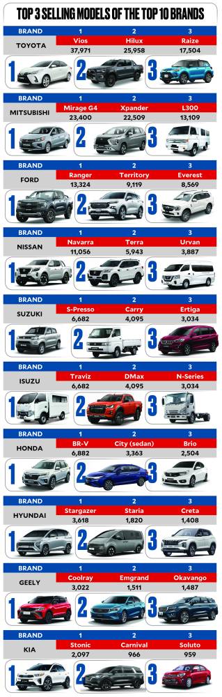 It is hardly surprising that among the top 10 sales performers of 2023, perennial market leader Toyota Motor Philippines Corp. (TMP) is the only brand with six-digit sales figures. Year-to-date December 2023, TMP sold 200,013 new vehicles, exceeding the 174,106 units it sold in the same period last year (see chart.)