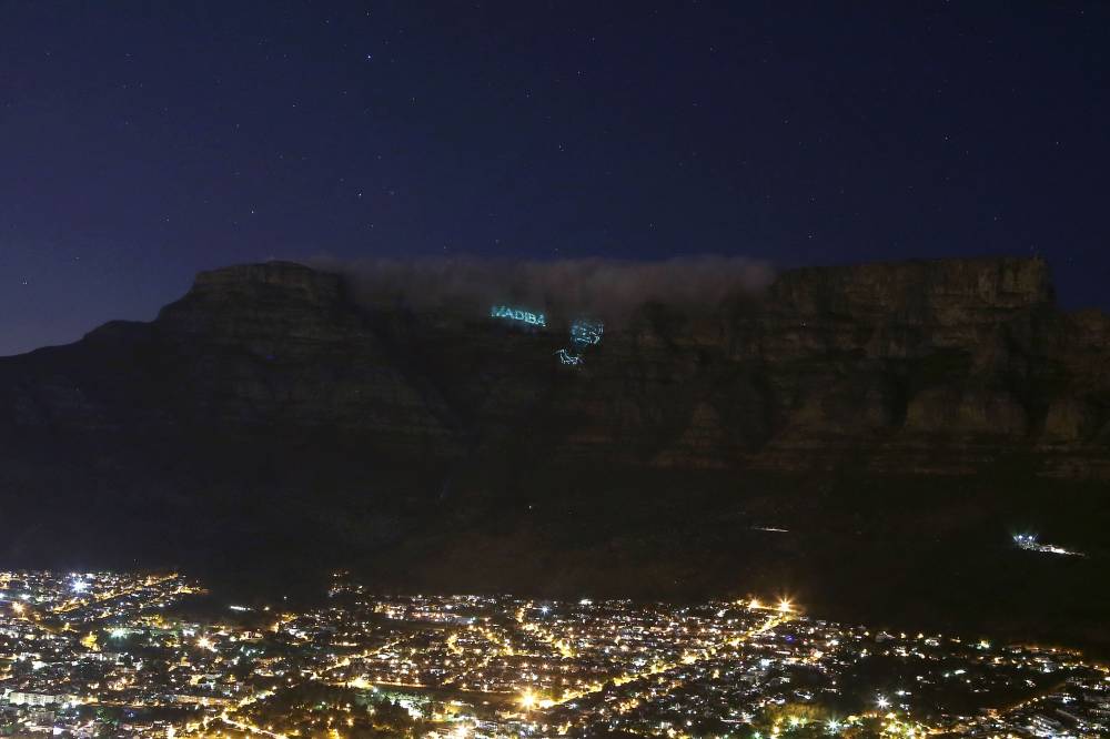 (FILES) A laser image of late former South African President Nelson Mandela’s face and his clan name “Madiba” is projected on the Table Mountain in Cape Town, late on December 10, 2013. Anti-apartheid hero Nelson Mandela has been seen as a moral compass in his home South Africa, but ten years after his death his legacy is vigorously debated, with some questioning the quality of the country’s democracy. (Photo by Jennifer BRUCE / AFP)