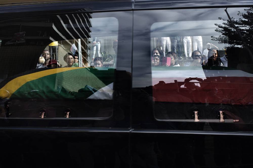 (FILES) People celebrate as the funeral cortege of South African former president Nelson Mandela drives to the Union Buildings for the lying in state on December 12, 2013 in Pretoria. Anti-apartheid hero Nelson Mandela has been seen as a moral compass in his home South Africa, but ten years after his death his legacy is vigorously debated, with some questioning the quality of the country’s democracy. (Photo by Marco LONGARI / AFP)