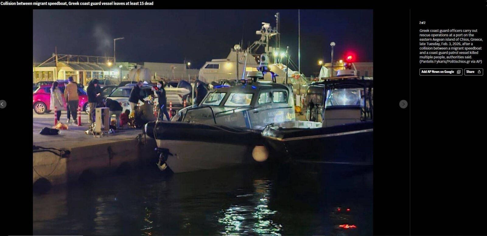 A collision between a speedboat carrying migrants and a Greek coast guard patrol vessel off the eastern Aegean island of Chios has killed at least 15 people, the coast guard said late Tuesday, while a search and rescue operation involving patrol boats, a helicopter, and divers was underway for potentially missing people.