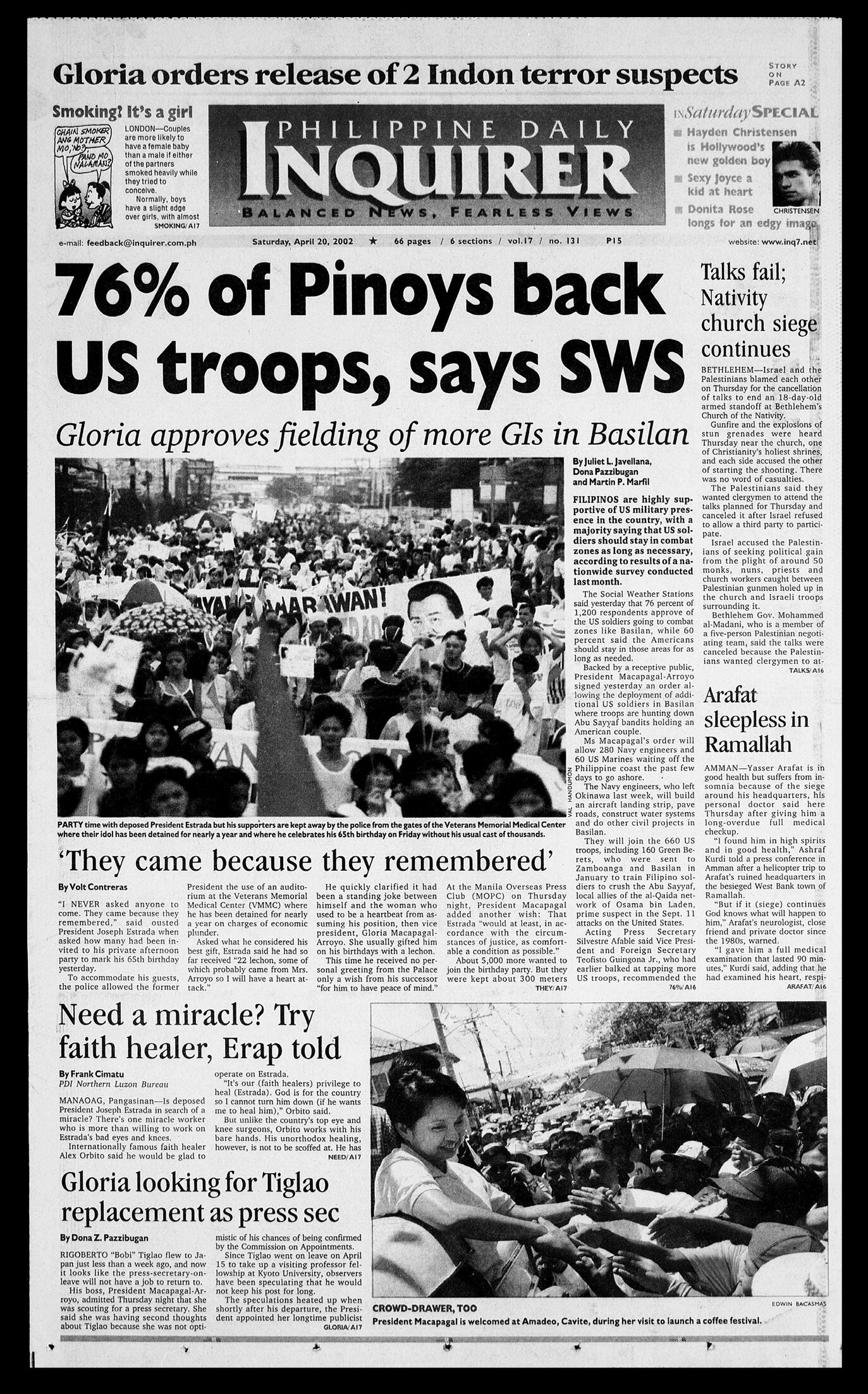 April 20, 2002: 76% of Pinoys back US troops, says SWS by Philippine Daily Inquirer April 20, 2025 April 20, 2002