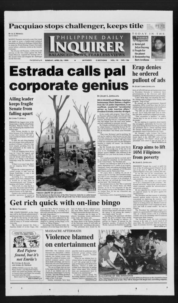 April 25, 1999: Estrada calls pal corporate genius by Philippine Daily Inquirer April 25, 2024 April 25, 1999. 0 Comments