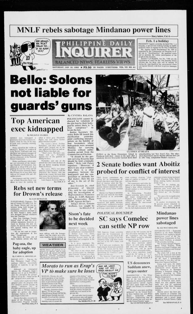 January 18, 1992: Bello: Solons not liable for guards’ guns by newspublish January 18, 2024 January 18, 1992. 0 Comments