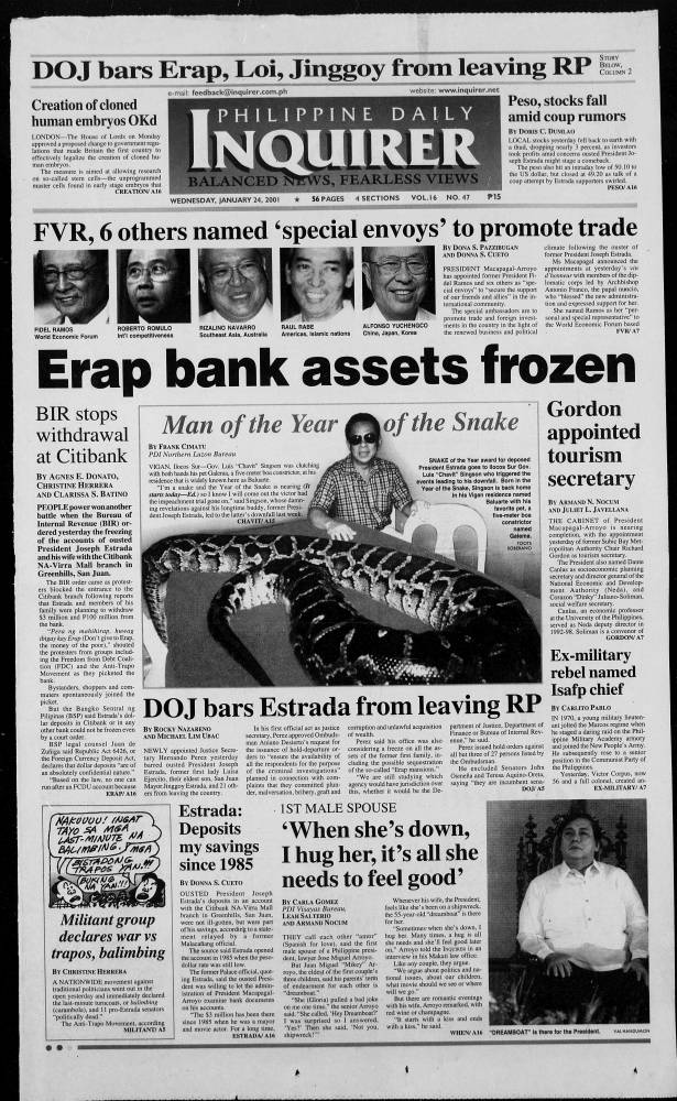 January 24, 2001: Erap bank assets frozen by Philippine Daily Inquirer January 24, 2024 January 24, 2001. 0 Comments