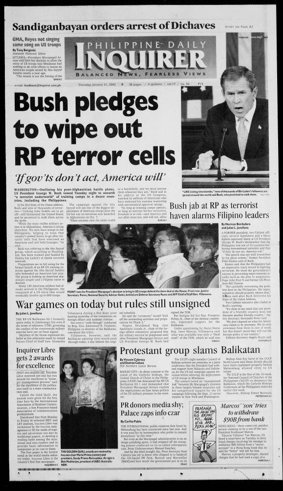 January 31, 2002: Bush pledges to wipe out RP terror cells by Philippine Daily Inquirer January 31, 2024 January 31, 2002. 0 Comments