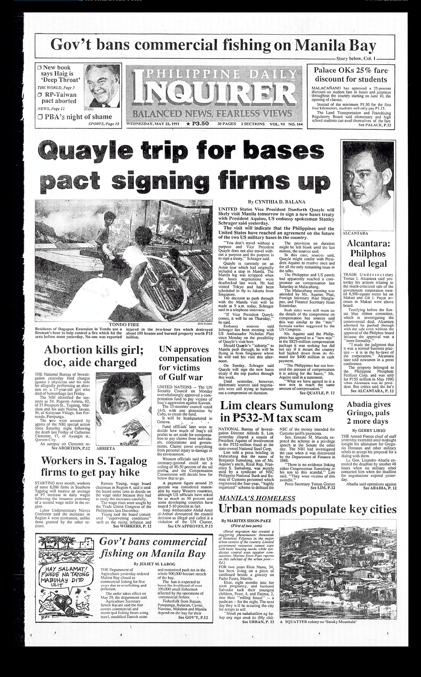 May 22, 1991: Quayle trip for bases pact signing firms up by Philippine Daily Inquirer May 22, 2025 May 22, 1991