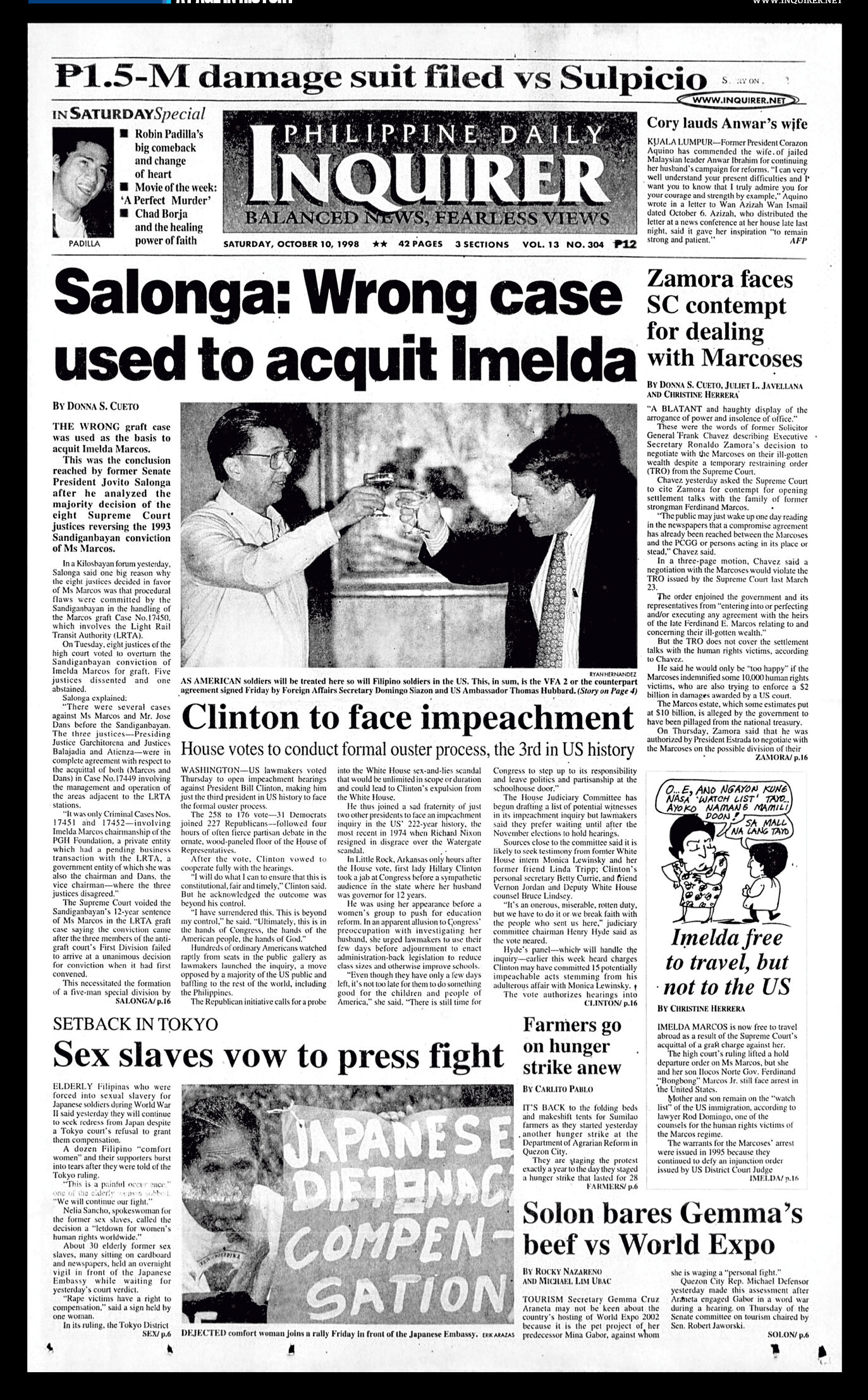 October 10, 1998: Salonga: Wrong case used to acquit Imelda by Philippine Daily Inquirer October 10, 2025 October 10, 1998