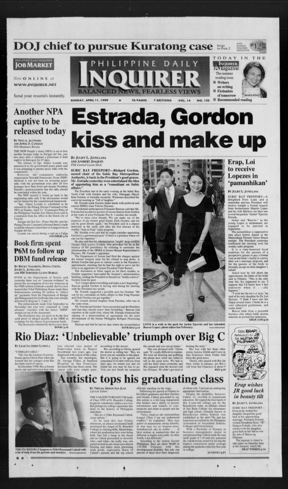 April 11, 1999: Estrada, Gordon kiss and make up by Philippine Daily Inquirer April 11, 2025 April 11, 1999.