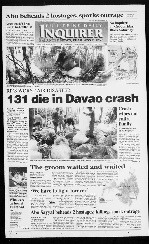 April 20, 2000: 131 die in Davao crash by Philippine Daily Inquirer April 20, 2024 April 20, 2000. 0 Comments