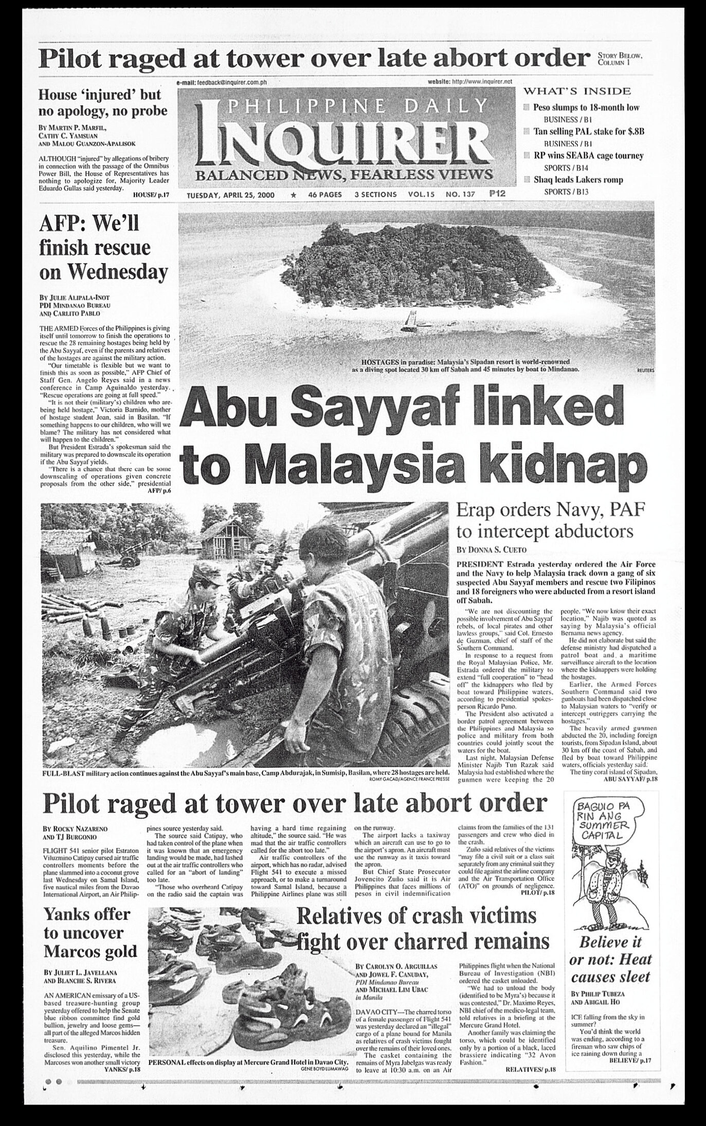April 25, 2000: Abu Sayyaf linked to Malaysia kidnap by Philippine Daily Inquirer April 25, 2025 April 25, 2000
