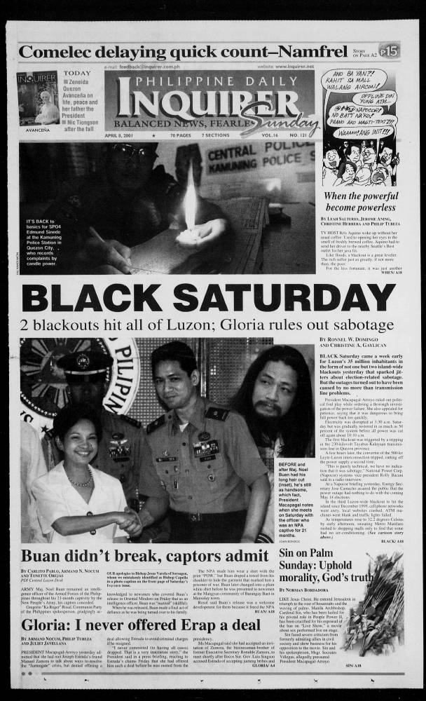 April 8, 2001: Black Saturday: 2 blackouts hit all of Luzon; Gloria rules out sabotage by Philippine Daily Inquirer April 8, 2024 April 8, 2001. 0 Comments