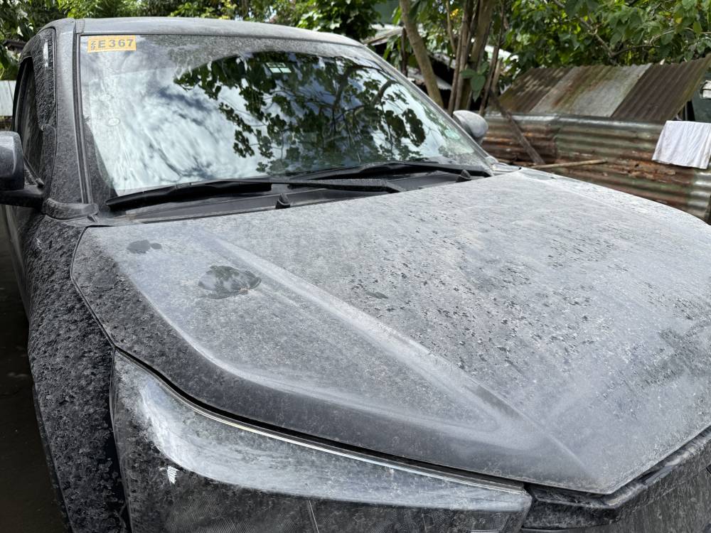 The ash, falling along with rain, covered vehicles and reduced road visibility, forcing motorists to repeatedly use windshield wipers. Some farmlands were also affected.