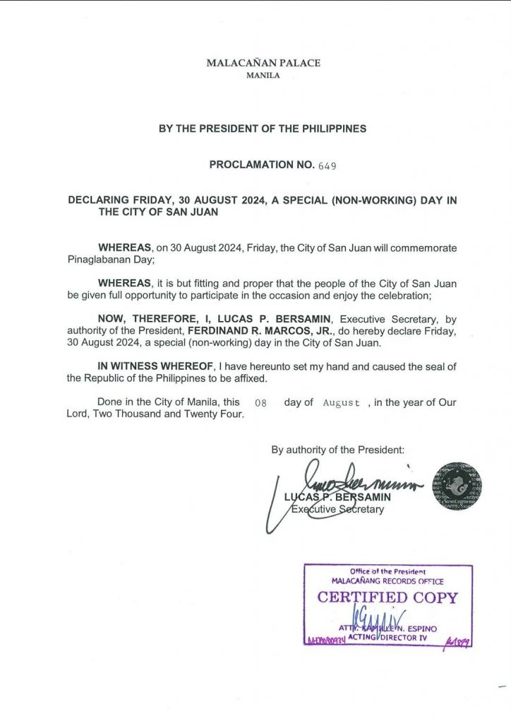 Aug. 30 declared holiday in San Juan City