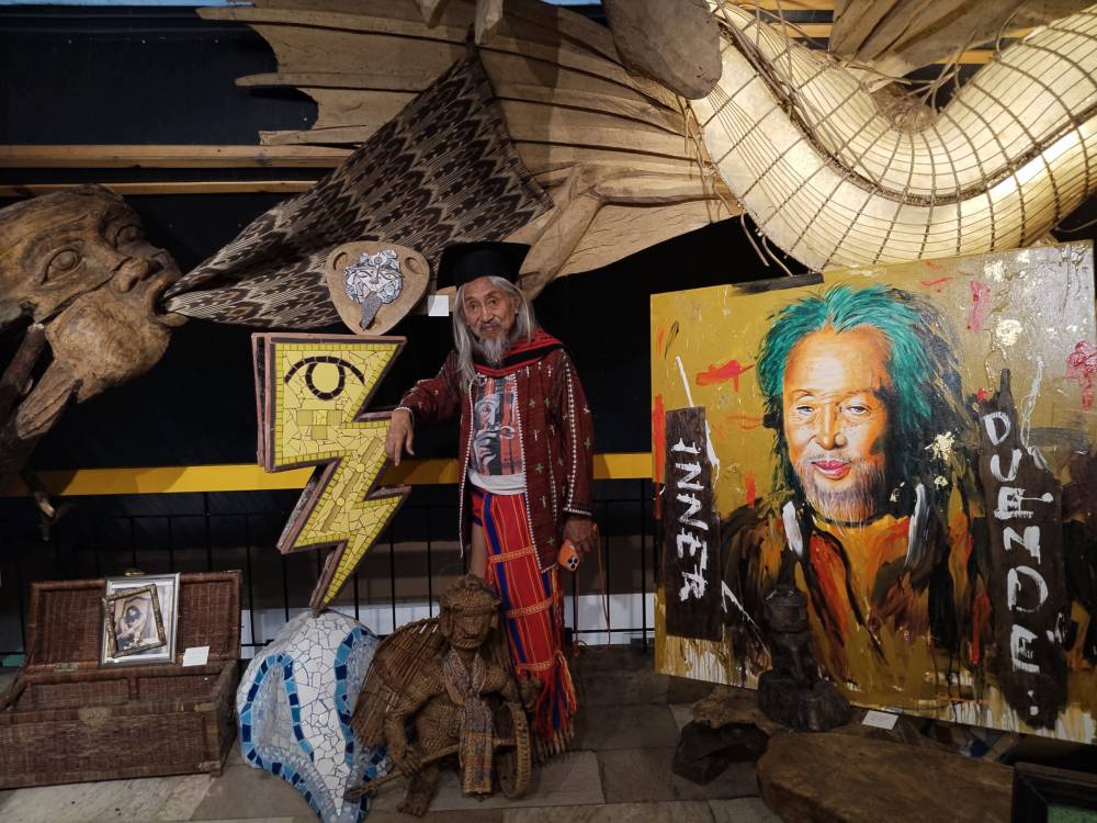 The paintings and drawings are interspersed between sculptures rendered by his artist friends like Kigao Rosimo and photographs, which traced Kidlat’s evolution from economist and Wharton School of Business alumnus Eric de Guia (his birthname) to the director of acclaimed art films like “Mababangong Bangungot (Perfumed Nightmare)” in 1977.