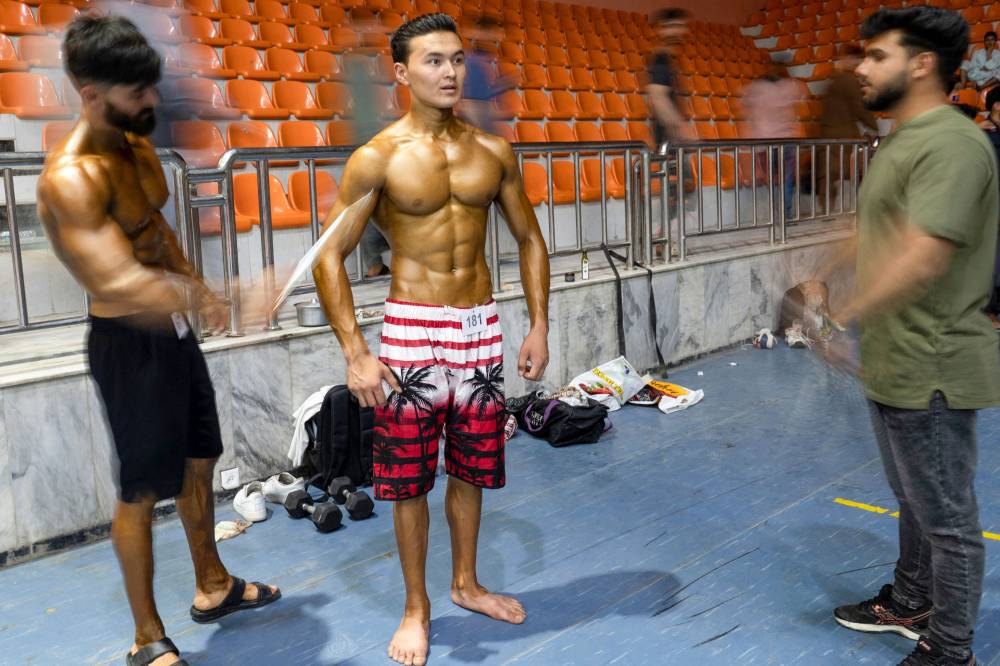 Afghan bodybuilders prepare backstage before a fitness event held by the Afghanistan Bodybuilding & Fitness Federation (AFBBF) in Kabul on July 9, 2024. On a stage inside Kabul Stadium, dozens of bodybuilders take turns flexing and posing in a bid to clinch the title of Mr Afghanistan — albeit with their legs modestly covered to just below the knee. Rigorously applying Islamic law, the Taliban have prohibited competitors from displaying their thighs, and imposed the wearing of long shorts. (Photo by Wakil KOHSAR / AFP)