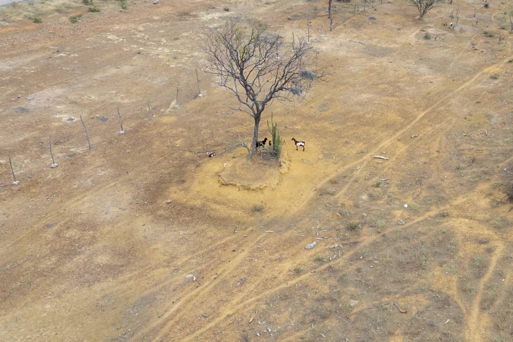 Aerial view of goats on the side of the road in Pinhoes, Bahia State, Brazil on June 12, 2024. The semi-arid Caatinga, a unique biome in the world, has lost more than 40 percent of its territory of traditional agriculture, land used now to intensive agriculture, mining, or wind energy generation, according to MapBiomas records. In addition, droughts, increasingly severe in Brazil and linked, according to experts, to climate change and the expansion of agribusiness, are increasing the pressure on this region, the poorest in the country. (Photo by Pablo PORCIUNCULA / AFP)