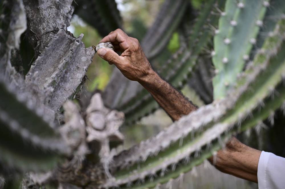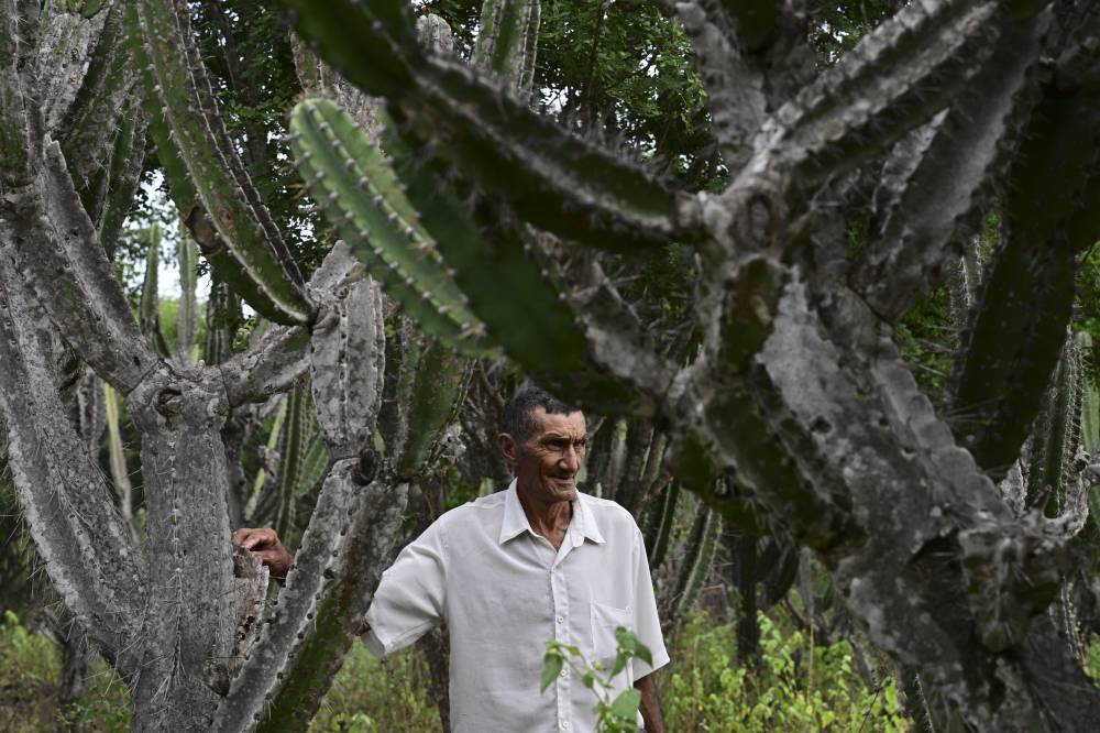 Alcides Peixinho Nascimento is pictured at his plantation of mandacaru —also known as cardeiro (Cereus jamacaru)— in Serra da Canabrava, Bahia State, Brazil on June 12, 2024. The semi-arid Caatinga, a unique biome in the world, has lost more than 40 percent of its territory of traditional agriculture, land used now to intensive agriculture, mining, or wind energy generation, according to MapBiomas records. In addition, droughts, increasingly severe in Brazil and linked, according to experts, to climate change and the expansion of agribusiness, are increasing the pressure on this region, the poorest in the country. (Photo by Pablo PORCIUNCULA / AFP)