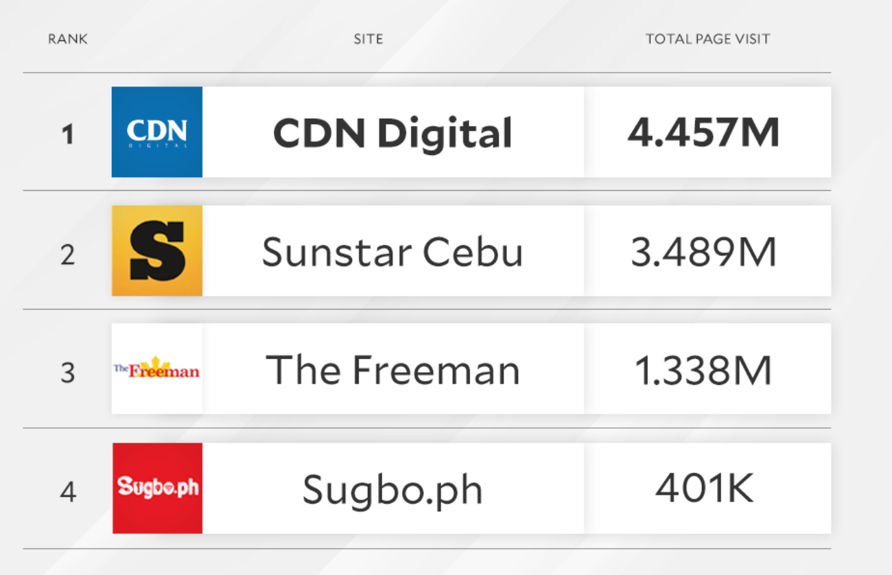 CDN Digital logged a total of 4.457 million visits during the January to August period covered by the platform. It topped other regional news outlets and lifestyle sites, including SunStar Cebu (3.489 million), The Freeman (1.338 million) and Sugbo.ph (400,510).