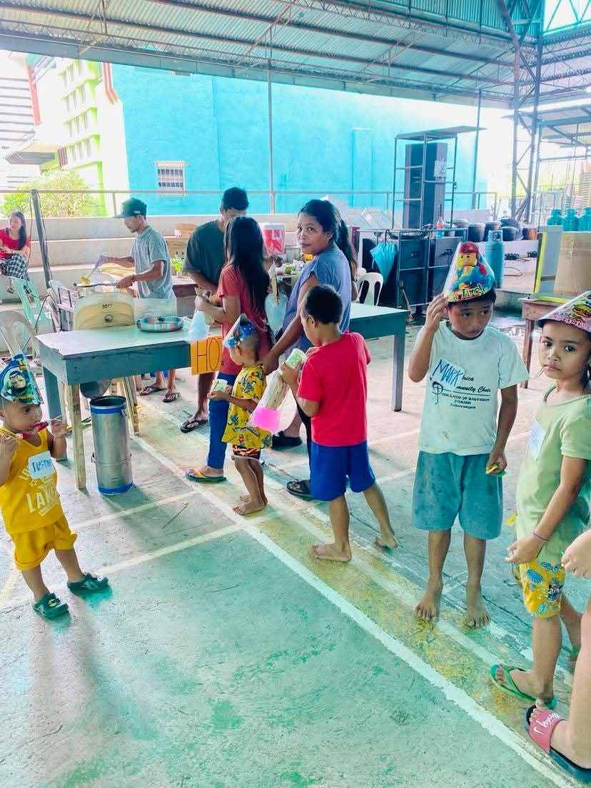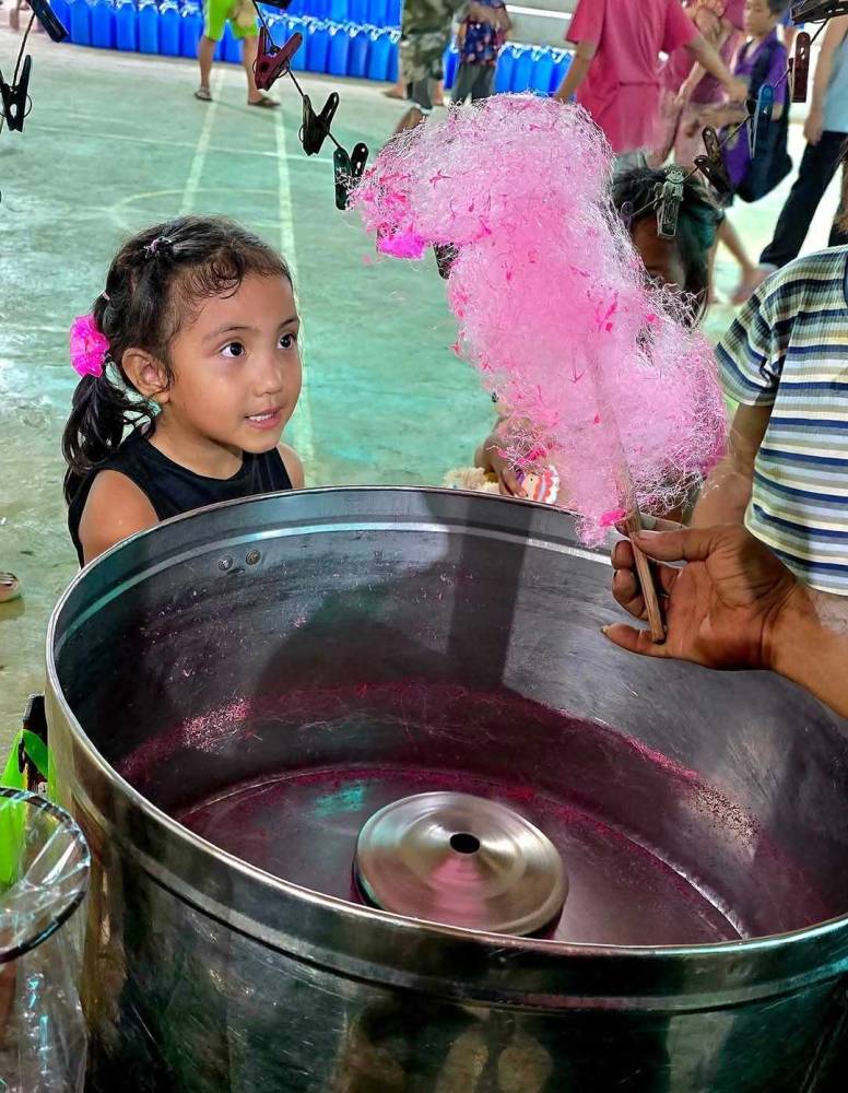 The party—held at the La Castellana National High School evacuation center—also had different food stations that served cotton candy, hotdogs on sticks, popcorn, pancakes and fries.