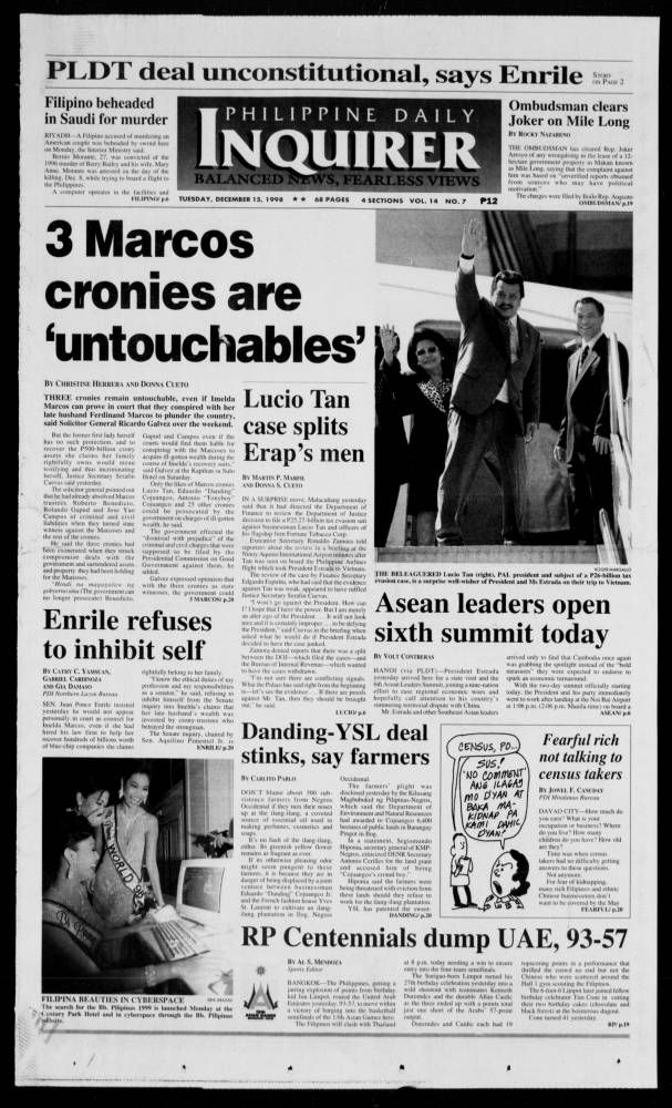 December 15, 1998: 3 Marcos cronies are ‘untouchables’ by Philippine Daily Inquirer December 15, 2023 December 15, 1998. 0 Comments