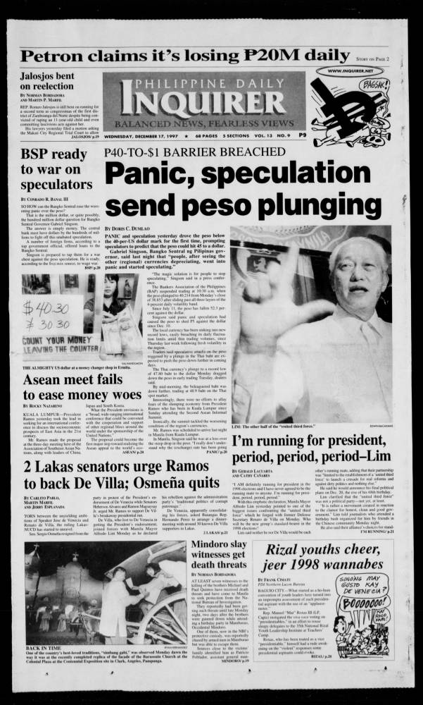 December 17, 1997: Panic, speculation send peso plunging by Philippine Daily Inquirer December 17, 2023 December 17, 1997. 0 Comments