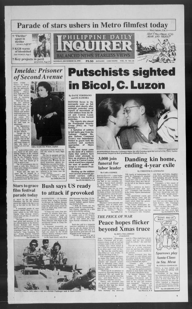 December 24, 1990: Putschists sighted in Bicol, C. Luzon by Philippine Daily Inquirer December 24, 2023 December 24, 1990. 0 Comments