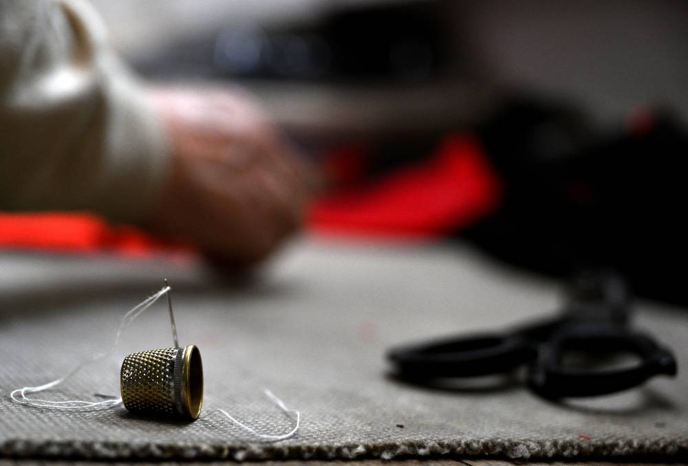 Mancinelli, assisted by his daughter and grandson, arms himself with scissors, pins, bobbins and buttons.