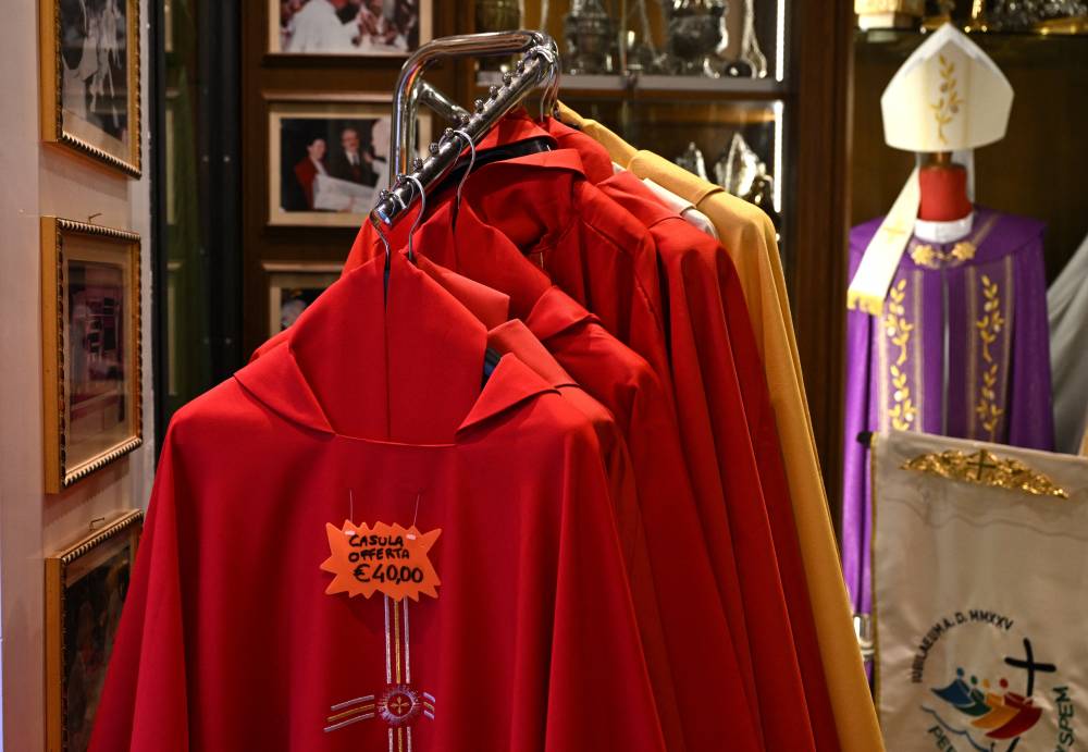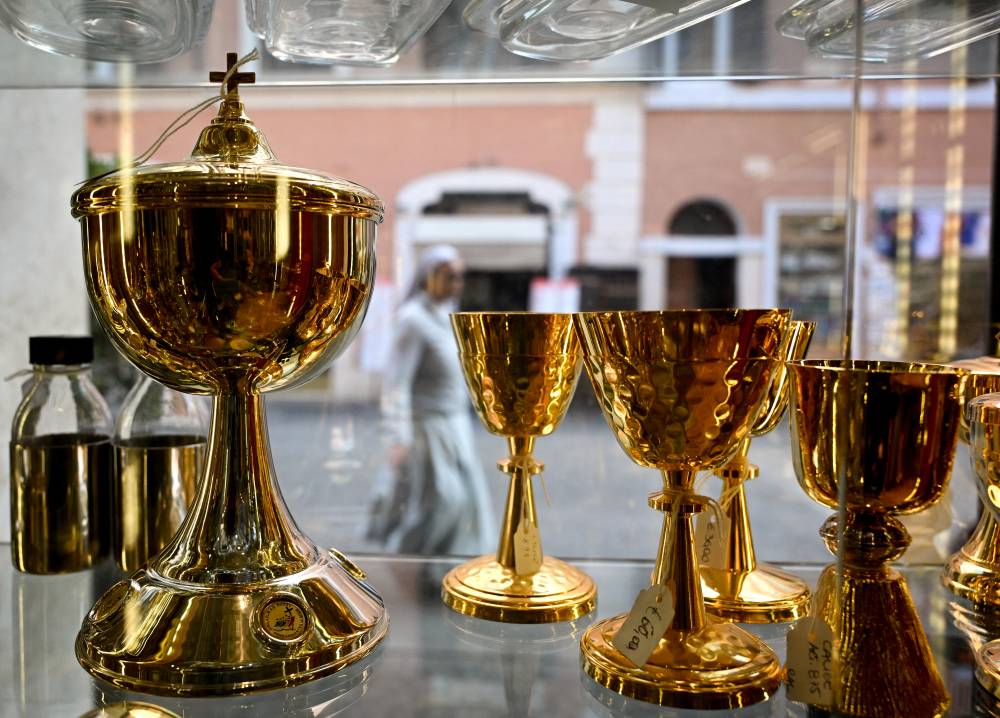 Gold chalices, embroidered headdresses, signet rings and rosaries with gleaming crucifixes fill the shop’s display cases.