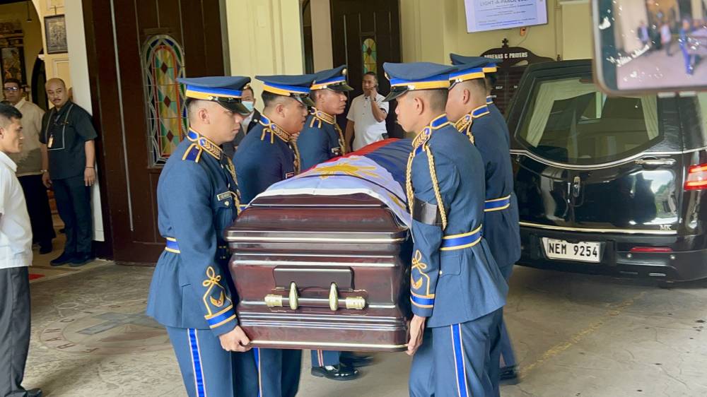A funeral Mass, attended by family members, colleagues, and friends, was held at the Santuario de San Antonio Church in Makati City before the burial.Uniformed personnel stood in formation outside the church as the flag-draped casket was carried out.