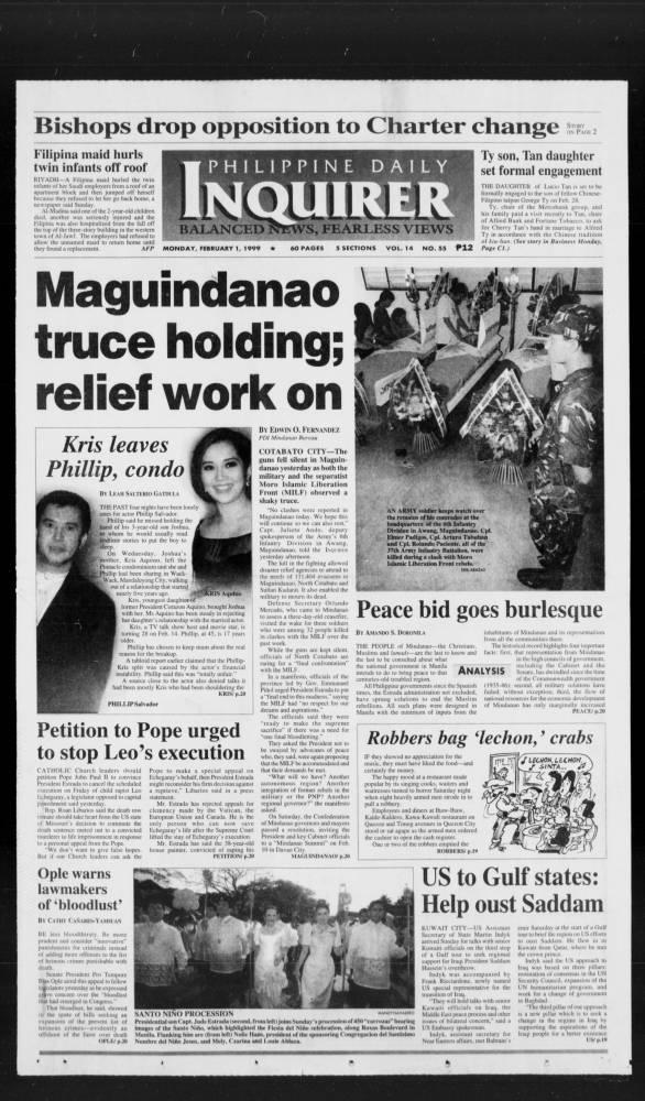 February 1, 1999: Maguindanao truce holding; relief work on by Philippine Daily Inquirer February 1, 2024 February 1, 1999. 0 Comments