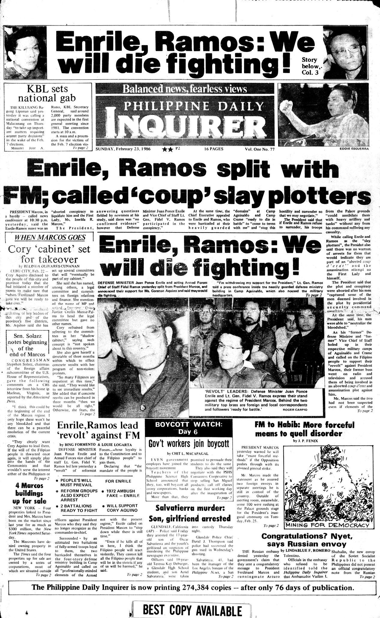 February 23, 1986: Enrile, Ramos split with FM; called ‘coup’ slay plotters by Philippine Daily Inquirer February 23, 2026