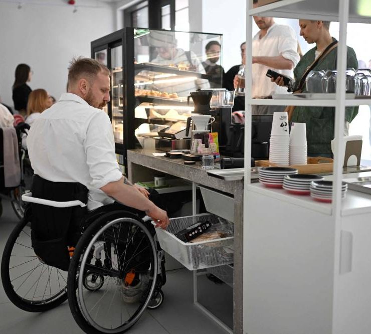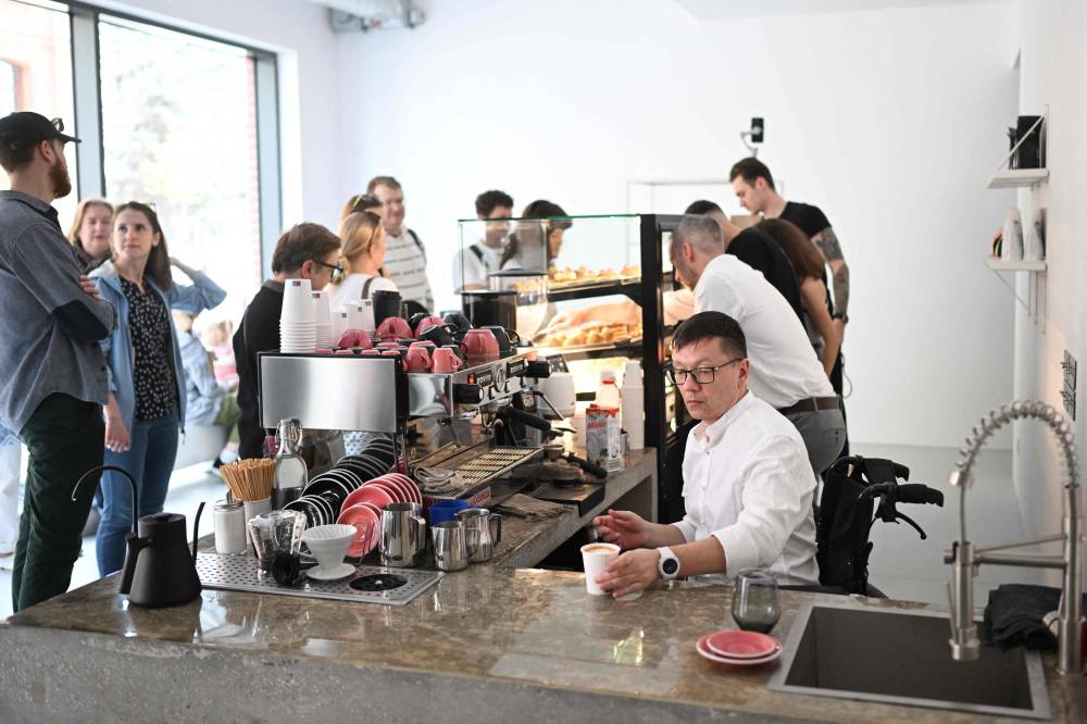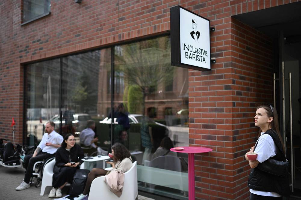 (FILES) People visit the coffee house 'Inclusive Barista', the first cafe in Poland with a workspace fully adapted for employees in wheelchairs, during its opening in Warsaw on April 7, 2024. With its sleek interior and freshly ground coffee bean scent, the cafe run by exiled Belarusian disability rights activist Sasha Avdevich may at first glance seem like yet another trendy spot in Warsaw. But the lowered, wheelchair-accessible countertop and a sticker reading as 'The barista on shift is with a hearing impairment' in Polish, English and Belarusian reveal this is no ordinary business. (Photo by Sergei GAPON / AFP)