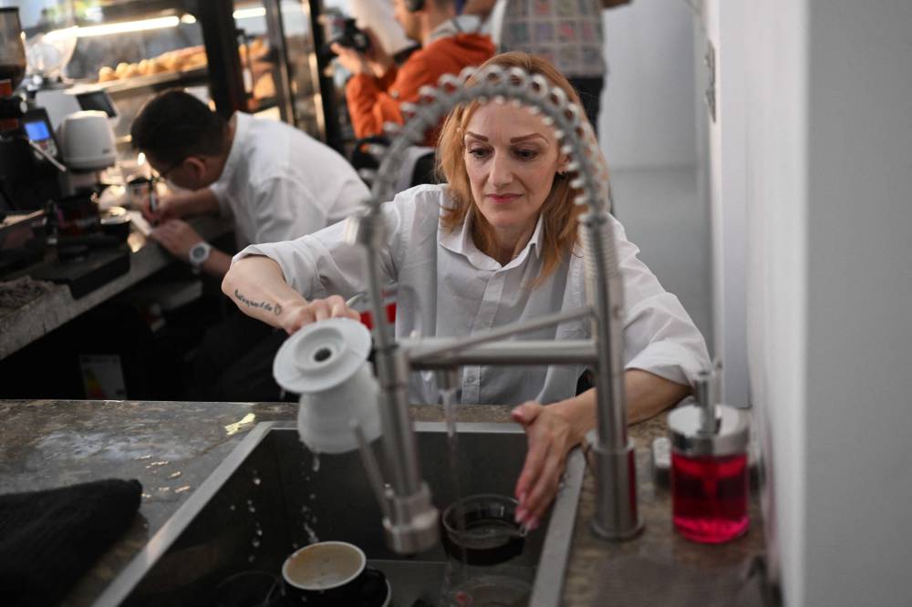 (FILES) Barista Olya washes dishes during the opening of the coffee house 'Inclusive Barista', the first cafe in Poland with a workspace fully adapted for employees in wheelchairs, in Warsaw on April 7, 2024. With its sleek interior and freshly ground coffee bean scent, the cafe run by exiled Belarusian disability rights activist Sasha Avdevich may at first glance seem like yet another trendy spot in Warsaw. But the lowered, wheelchair-accessible countertop and a sticker reading as 'The barista on shift is with a hearing impairment' in Polish, English and Belarusian reveal this is no ordinary business. (Photo by Sergei GAPON / AFP)