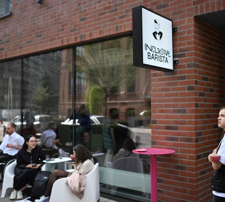 But the lowered, wheelchair-accessible countertop and a sticker reading: “The barista on shift has a hearing impairment” in Polish, English and Belarusian reveal this is no ordinary business.