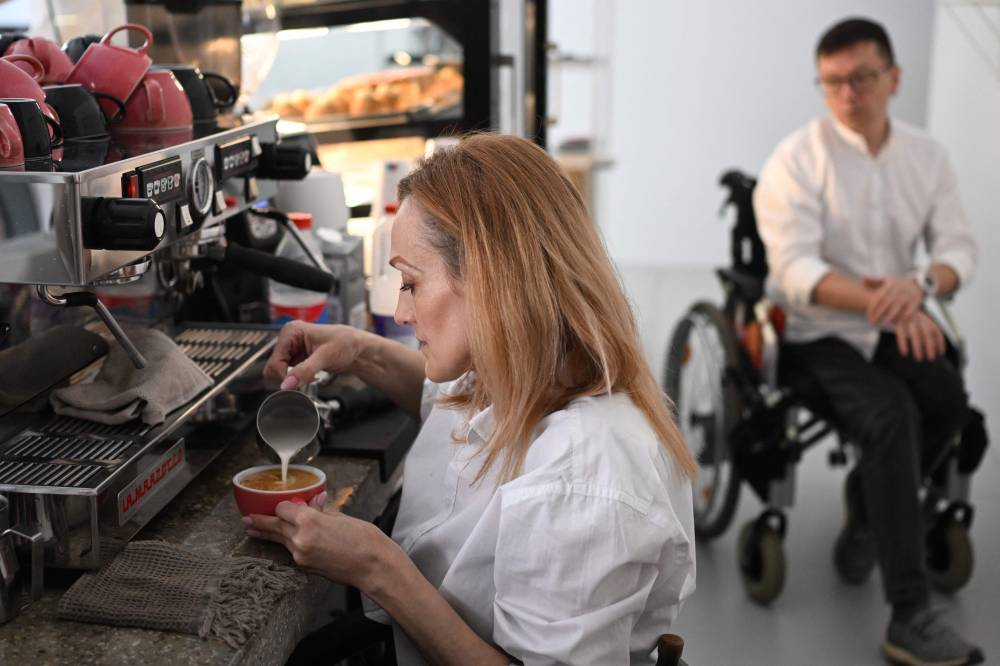 (FILES) Barista Olya makes coffee during the opening of the coffee house 'Inclusive Barista', the first cafe in Poland with a workspace fully adapted for employees in wheelchairs, in Warsaw on April 7, 2024. With its sleek interior and freshly ground coffee bean scent, the cafe run by exiled Belarusian disability rights activist Sasha Avdevich may at first glance seem like yet another trendy spot in Warsaw. But the lowered, wheelchair-accessible countertop and a sticker reading as 'The barista on shift is with a hearing impairment' in Polish, English and Belarusian reveal this is no ordinary business. (Photo by Sergei GAPON / AFP)